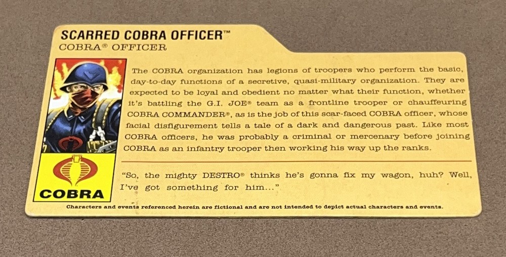 You are Purchasing: 2008 COBRA OFFICER (V6) Scarred Cobra Officer With File Card GI Joe 3.75 inch Figure Comes with what you see. Please view pictures for condition. Item pictured is item you will receive. We combine shipping. First item is full shipping and $1.50 each additional item purchased . PLEASE REQUEST COMBINED SHIPPING TOTAL BEFORE PAYING.