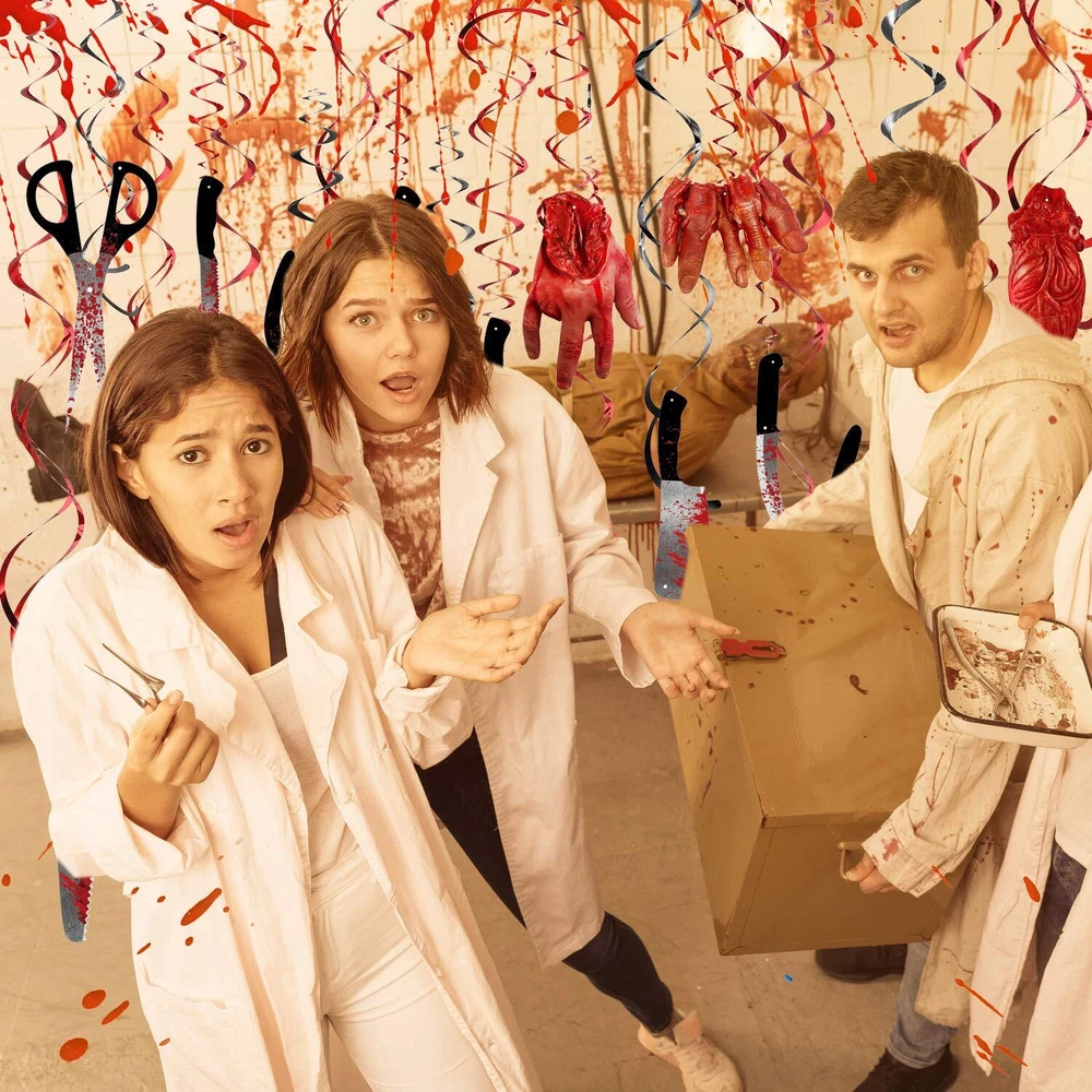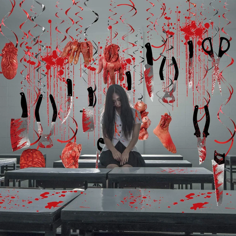 Halloween blood weapon hanging swirl decoration, fake scary broken blood hands and feet broken body parts foil swirl for haunted house Halloween vampire zombie party decorations supplies, 30 count Widely applicable: Quality party swirl decorations will just need a few minutes to gently separate, these Halloween decor for your home, kitchen, bathroom, yard, porch, tree, etc.create a horror movie atmosphere. Simple to use: There is one hook on the top of the swirl for easy display, just take it out and hang it up. Quality design will not easy to break, reusable and reliable, they will make you and your guests more joyful to enjoy the party. Specifications: Size: 28 x 28 cm/ 11 x 11 inch styles: as pictures shown Package includes: 18 x Foil swirl decorations with cutouts 12 x Double spiral decorations without cutout Notes: Due to computer resolution, sunlight, indoor lighting, and other factors, there might be a little color difference. Proper size: the size of each Halloween blood theme cutout card is approx. 28 x 28 cm/ 11 x 11 inch; Each swirl can extend to approx. 28 - 36 inch in length; You can hang it anywhere you like, to create a horror movie atmosphereper size: the size of each Halloween blood theme cutout card is approx. 28 x 28 cm/ 11 x 11 inch; Each swirl can extend to approx. 28 - 36 inch in length; You can hang it anywhere you like, to create a horror movie atmosphere Great decorating bundle: including 30 pieces of foil swirl decorations, among which are 18 foil swirl decorations with Halloween blood weapon theme cutout cards and 12 double spiral decorations without cutouts, wonderful decorative props for Halloween Durable material: made of metallic foil and quality card stock, not fragile and not easy to bend, double-sided printed; These Halloween blood hanging swirls are durable enough to be applied many times on different occasions, bring you an atmosphere of horror for your Halloween blood party Wide application: features a variety of blood splattered horror props, classic, bloody weapons and scary hands, feet and body parts design are ideal for haunted houses, graveyard scenes, Halloween parties and other parties for frightening trick-or-treaters; Hang up on the wall and turns any room in to a horrific movie scene; Ideal for Halloween party decoration Halloween blood theme party design: comes with weapon, fake hand, fake foot, fake heart, fake eyes, fake fingers, fake lung, false brain, etc.; These are wonderful accessories for Halloween horror theme, realistic and bloody human organs design, will bring a great experience to your Halloween blood party