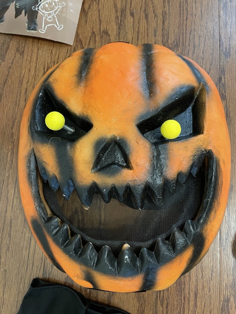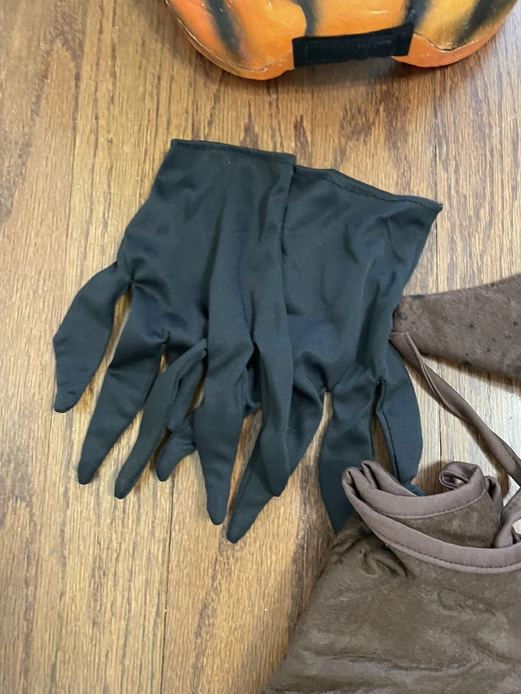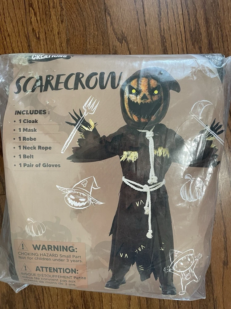 Scary Scarecrow Pumpkin Costume w/Pumpkin Mask Kids size L 10/12 NEW New, open package to show content. Does not include shoes. Wicked Scarecrow Pumpkin Bobble-Head Ghoul Costume Includes Brown Hood, Rope Collar, Evil Pumpkin Mask, Patchwork Dress Robe, Rope Belt and Scarecrow Gloves.
