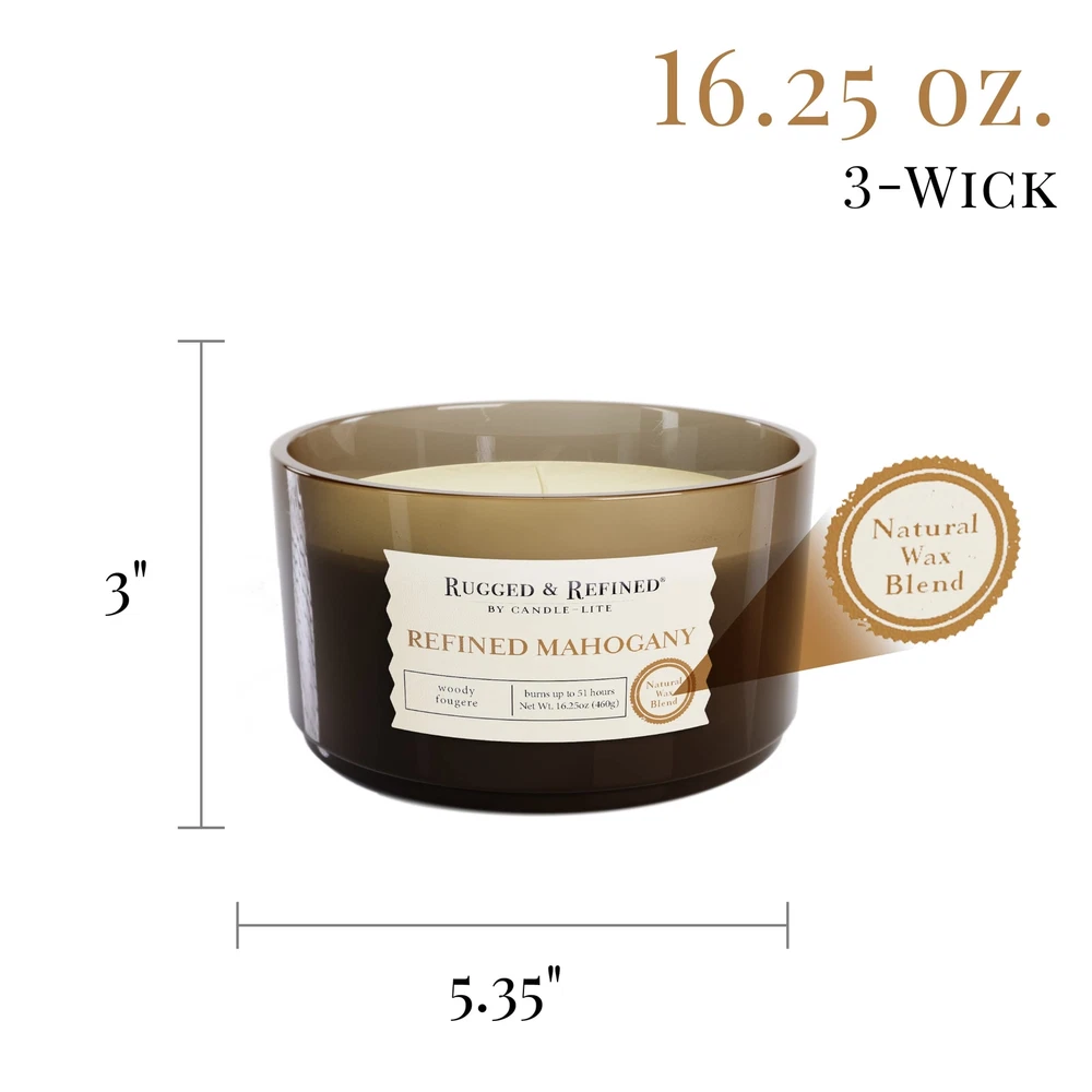 Discover a new line of masculine candles featuring sleek, earth tone, glass vessels, this collection of refreshing and bold fragrences elevates every room. Meet by Candle-Lite Company. Bring that warm and sweet scent into your home with this Refined Mohogany scented candle. This fresh scent offerswoody notes of strong mahogany wood, tree moss, spicy cedarwood, a touch of citrus, and warm amber making it one of the best candles for men & women. Measuring 5.35"L x 5.35"W x 3"H, this candle is the perfect size to place in any room. Enjoy a calming glow no matter where you are with this 16.25 oz. candle. Whether you’re working in your home office, enjoying game night with friends, or curling up on the couch for a movie night, this candle is perfect for any occasion. This 3-wick candle has three 100% cotton wicks, is lead free, and burns up to 51 hours. Not only does this white-colored paraffin wax candle accent your home décor, but it releases a calming fragrance while maintaining a consistent burn for you to enjoy. Always remember to candle with care and burn within sight. Keep candles away from children, pets, and things that can catch fire. Stop use when .5” of unmelted wax remains and extinguish every 4 hours for cooling. Trim the candle wick to .25” prior to each use. Lighting America’s hearts and homes since 1840, Candle-lite Company has been crafting quality candles in Ohio’s heartland for over 180 years. Create an inviting atmosphere with these candles for home scented with varied fragrances suitable for all the different rooms. Every Candle-lite product is 100% satisfaction guaranteed. Whether it's floral, fresh, fruity or gourmand, we have a fragrance for you. AROMATHERAPY CANDLE – This woody scent offers an escape deep in a mohogany forest with towering trees for miles making it one of the best candles for women & men THREE WICK CANDLE – This Candle-lite candle has a three 100% cotton wicks and burns up to 51 hours. Its white paraffin candle wax not only accents your home décor but releases a calming scent while maintaining a consistent burn. PERFECT FOR ANY ROOM – Bring that warm, woody scent into any room with this 16.25 oz. candle. Whether you’re working in your home office, enjoying game night with friends, or staying in for a movie night, this candle is perfect for any occasion. CANDLE WITH CARE – Always remember to burn within sight and keep away from children, pets, and things that can catch fire. Stop use when .5” of unmelted wax remains and extinguish every 4 hours for cooling. Trim the candle wick to .25” prior to each use. - Discover a new line of masculine candles featuring sleek, earth tone, glass vessels, this collection of refreshing and bold fragrences elevates every room.