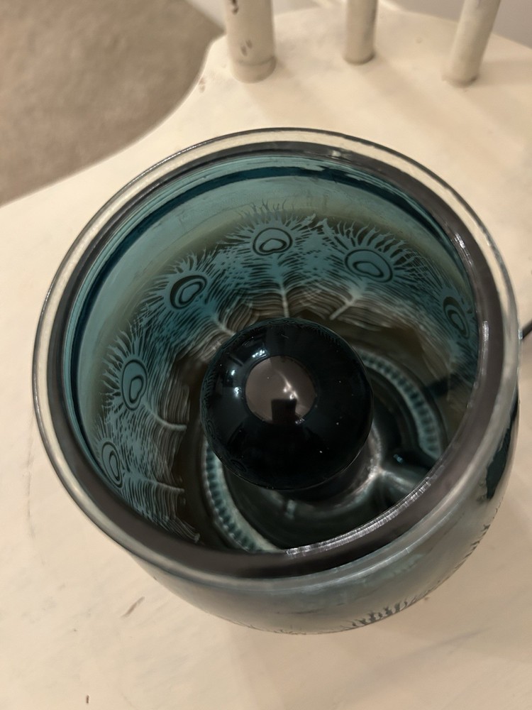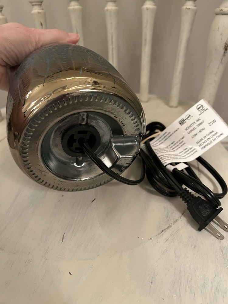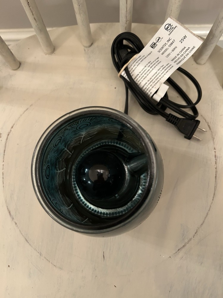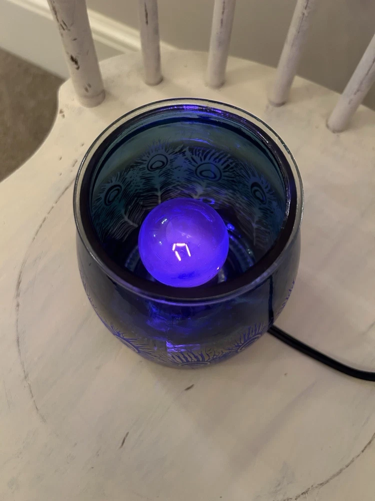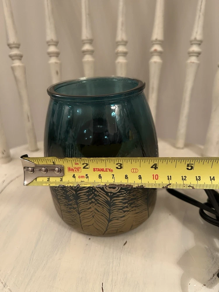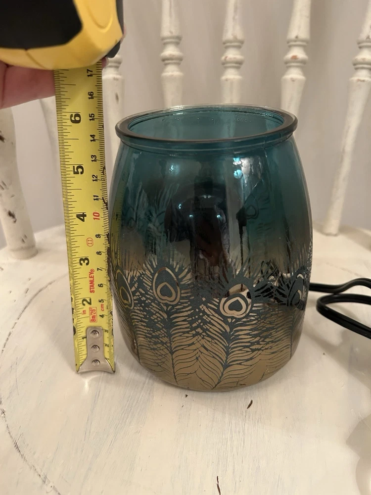 This retired Scentsy Electric Wax Warmer in Blue and Gold with a Peacock Feather pattern is a stylish and elegant addition to any home. This bowl-shaped warmer is made of glass and powered by a wall plug-in. With a diameter of 4.5 inches and a height of 5.5 inches, it is designed to hold and heat scented oils or wax to create a fragrant ambiance. The bold design and high-quality materials make this electric oil/wax warmer a perfect choice for adults looking to enhance their living space with a touch of luxury. Like new.