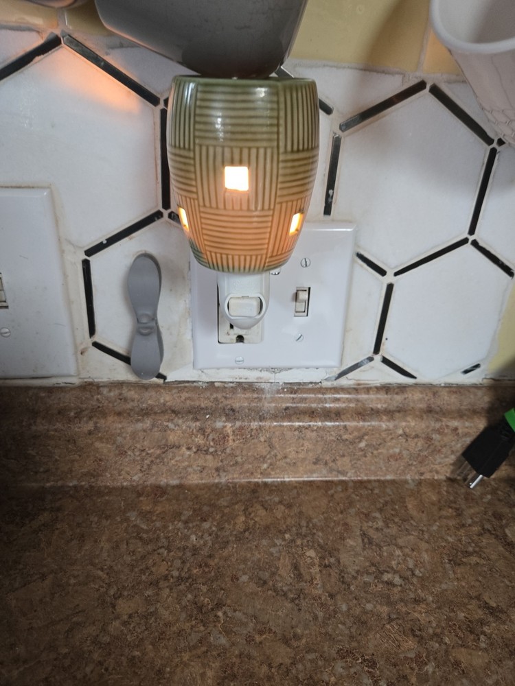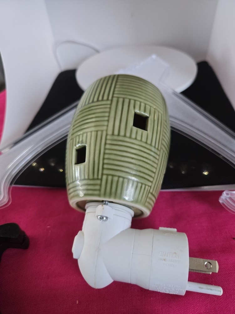 The Scentsy Green Bamboo Basket Weave Wall Plug-In Wax Warmer Night Light is a stylish and elegant addition to any room. Replaced screw see pik This medium-sized solid green wax warmer features an art deco style with a glossy finish, perfect for adding a touch of ambiance to any space. The wall plug-in design makes it easy to use and helps to create a relaxing atmosphere with its soothing night light. Plus, it doubles as a deodorizer and includes embellishments for added flair. Simply add your favorite wax scent to enjoy the benefits of aromatherapy in any room.