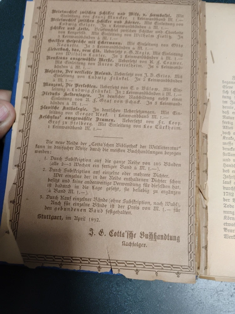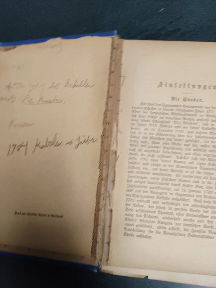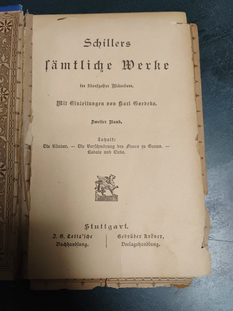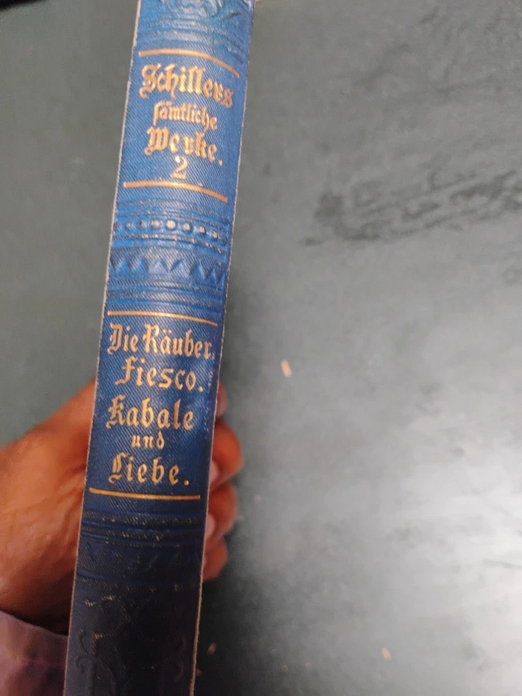 This vintage hardcover book titled "Schillers Famtliche Werke: Die Rauber, Fiesco, Kabale und Liebe" or ''Schrillers Complete Works: The Robbers, Fiesco, Intrique and Love'' by Schiller. Written in German this book falls under the genre of fiction and is a collection of works by Schiller that includes famous titles such as "Die Rauber," "Fiesco," and "Kabale und Liebe." A valuable addition to any book collection, this vintage hardcover edition offers readers a timeless literary experience in the original language. Schillers Famtliche Werke: Die Rauber, Fiesco, Kabale und Liebe VTG Hardcover This book is in acceptable shape for its age. There are loose pages and other signs of wear in this old book with an unknown date. See the photos for more.