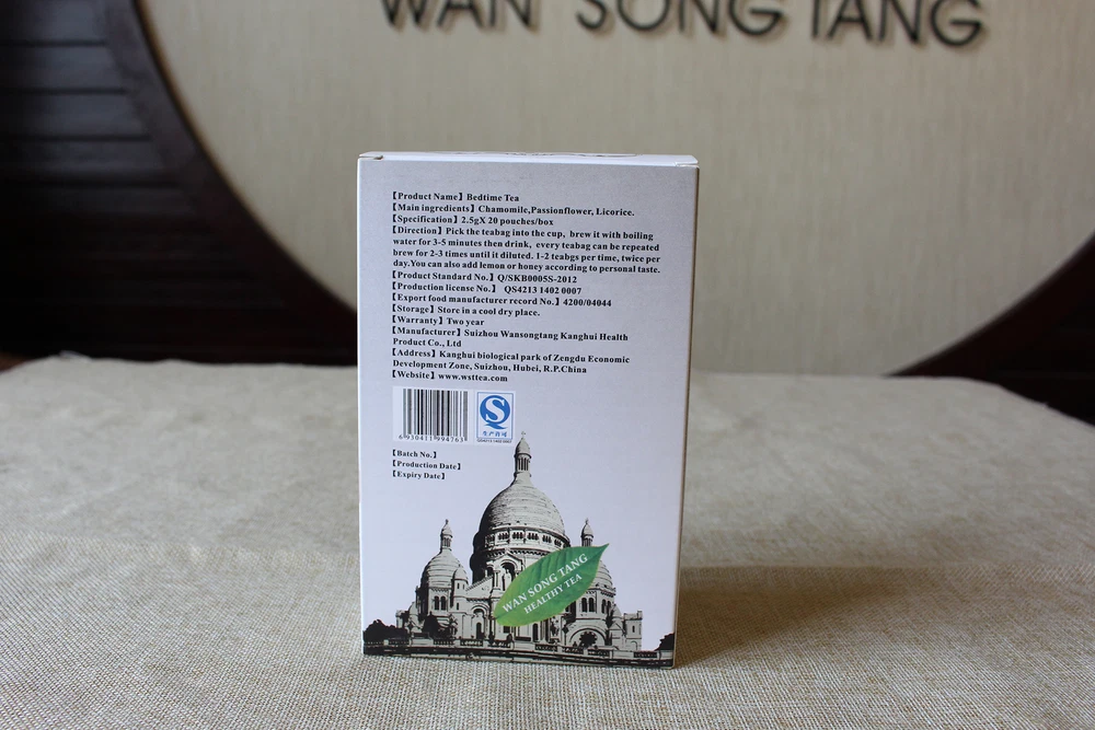Description Name Factory Wholesale Sleeping tea / Night tea / Relax tea For Improving Sleeping Quality Specification 2.5g×20bag/box ,3g×20bag/box Main Ingredients Chamomile,Passionflower, Licorice Function 1, Promote relaxation and sleep 2,Regulate endocrine system to calm body nervousness and mind to promote a good night’s sleep 3,Reduce daily stress to support you a sweet sleep Direction Pick the teabag into the cup, brew it with boiling water for 3-5 minutes then drink, every teabag can be repeated brew for 2-3 times until it diluted. You can also add lemon or honey according to personal taste Min order quantity ≥3000box Applicable People Chronic insomnia group, people with poor sleeping quality after pressure, elderly difficult to sleep, people easy to wake up or have nightmare Storage Keep in a dry and cool place Port SHANGHAI, GUANGZHOU ,SHENZHEN Delivery time 30-40days Packing information Tea+filter paper bag + plastic envelop+carton P ayment terms ◊ Payment terms: T/T,Western Union, balance before shipment, L/C is available. ◊ Trade terms: FOB,CIF,CNF&EXW are available Transportation B y sea , by Air Advantages of Our Products ◊ The big and professional tea bags manufacturer in China. ◊ Safe quality, 100% nature organic raw material . ◊ Eco-friendly, pass GMP& ISO9001 , etc. ◊ Welcome OEM orders. ◊ Variety products, meet different needs. products feature Improving Sleep Tea, tea drinks for insomnia is made from the most comfort, sedation natural herbal extract. It does not contain any additives, no dependence, no drowsiness, no side effects, no contraindications when taking period. It is a healthy drink with natural sweet taste and fragrance. In a very short period of time it can regulate the brain's organism, make it in equilibrium, so that improve sleep quality of different degrees of insomnia. It can refresh the nerves, regulate the nervous system, endocrine system and body organs , make tissue harmony between the normal circadian rhythm, promote human physiological sleep back to nature, a fundamental solution to insomnia problem. The symptoms caused by insomnia such as dizziness, fatigue, weakness disappear together after long time drinking, making people no longer worry about insomnia. It will calm your mind, free you from anxiety and keep you in good spirits every day. Also it can help skin metabolism, play a role on skin health beauty. But it is completely different from sleeping tablets, you can drink it any time every day Products details