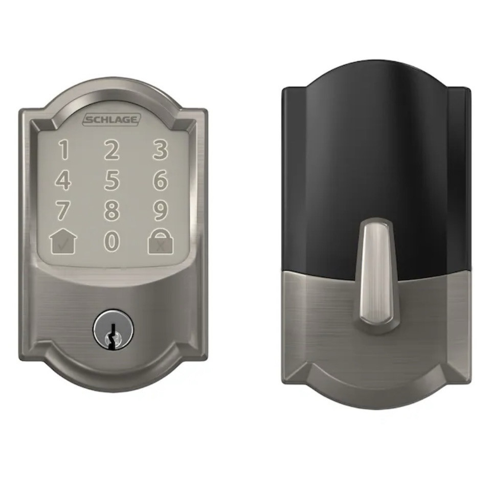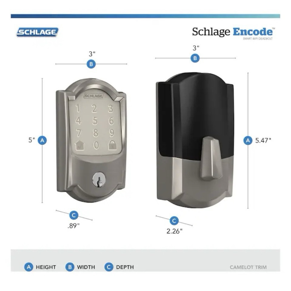 The Schlage Encode Smart Wi-Fi Deadbolt in Satin Nickel is a contemporary-style deadbolt suitable for residential front entrance doors. It features an adjustable backset, electronic functionality, and comes with a key for added security. With universal mounting, this Schlage Encode model offers convenience and peace of mind for homeowners looking for a sleek and modern lock solution.