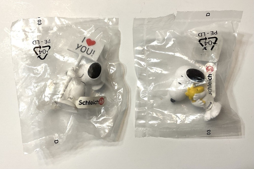 The product is a set of two Schleich figurines featuring characters from the Peanuts franchise – Snoopy hugging Woodstock and a "I Love You" Snoopy. These collectible figures are part of the Animation Merchandise category and are ideal for fans of the beloved comic strip. The Schleich brand is known for producing high-quality figurines that capture the essence of the characters, making these toys a must-have for any Peanuts enthusiast.