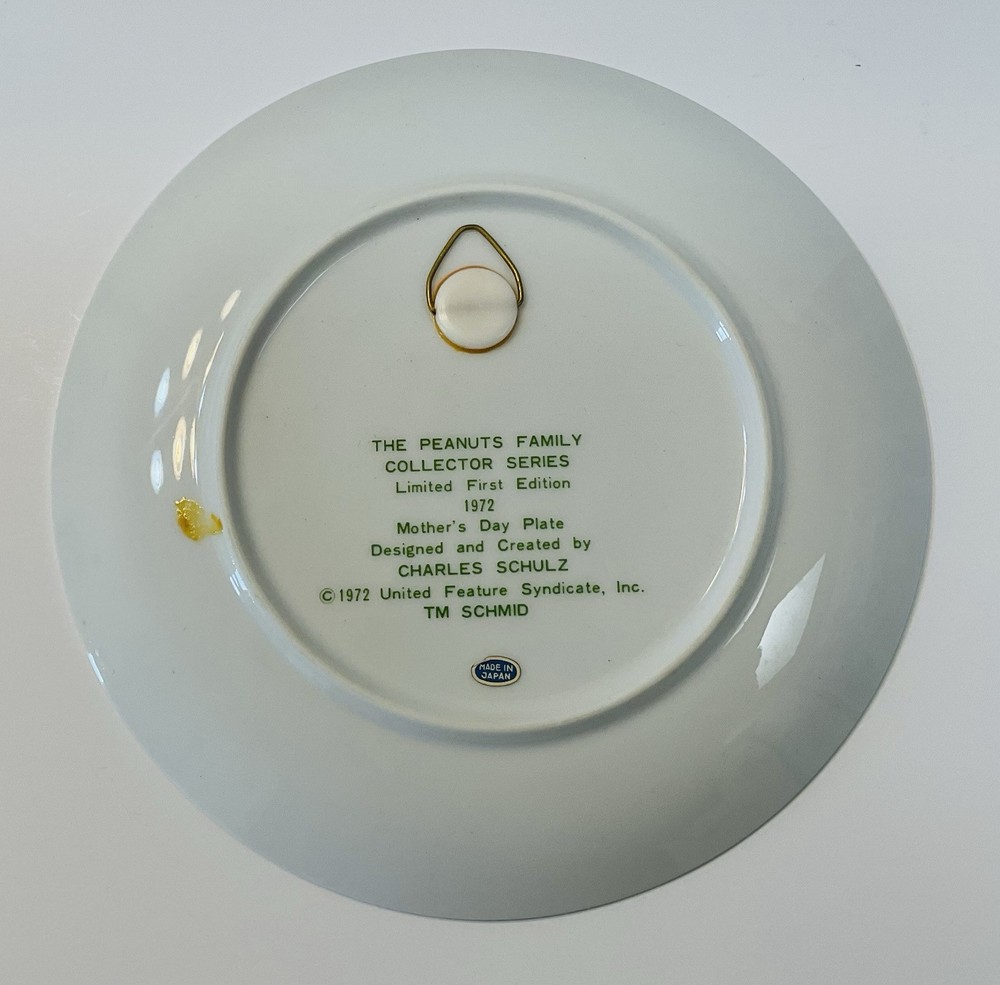 The Schmid Peanuts Mother's Day Collector Plate from 1972 features Linus holding a rose, making it a charming and nostalgic decorative collectible for any occasion. The plate showcases a classic design with a floral pattern, perfect for celebrating Mother's Day or any special day with a touch of sweetness.