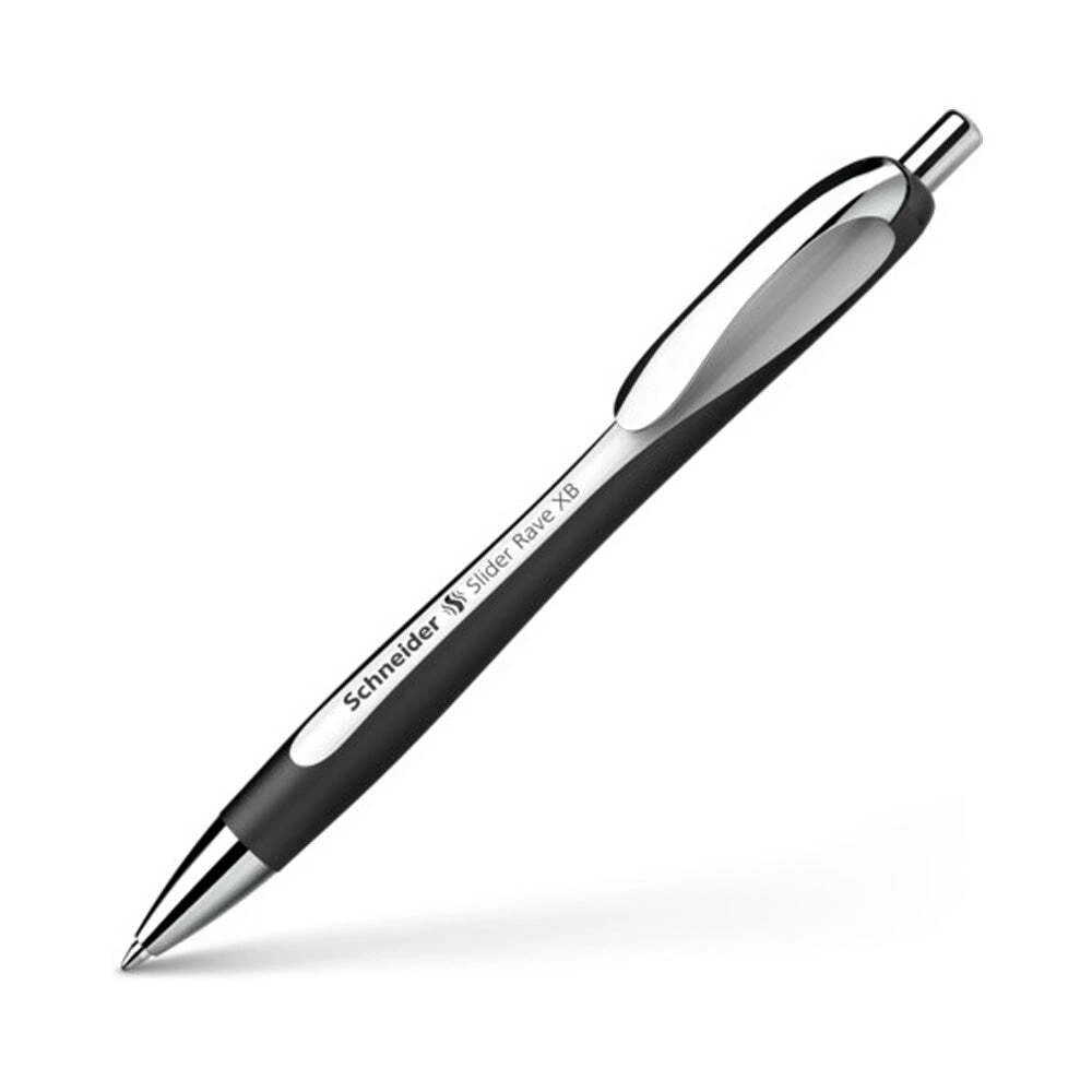Schneider Slider Rave Ballpoint Pen, White & Black Extra Broad (XB) Blue Ink Color The Schneider Slider Rave is a retractable pen with a comfortable non-slip, ergonomically-shaped barrel for relaxed writing without hand fatigue. Smoother than gel! The Slider has established itself as a top-quality ballpoint utilizing Schneider's innovative Viscoglide ink - a high-performance hybrid ink that combines the best features of traditional ballpoint ink and gel ink. Super-smooth writing action and very fast-drying, the Viscoglide technology ensures exceptionally easy, gliding writing. The ink dries quickly so that a highlighter can be used without smudging the writing. Equipped with a Slider refill - also accepts any Parker-style refill. Made in Germany. Blue ink is waterproof. XB point line width: 1.4 mm