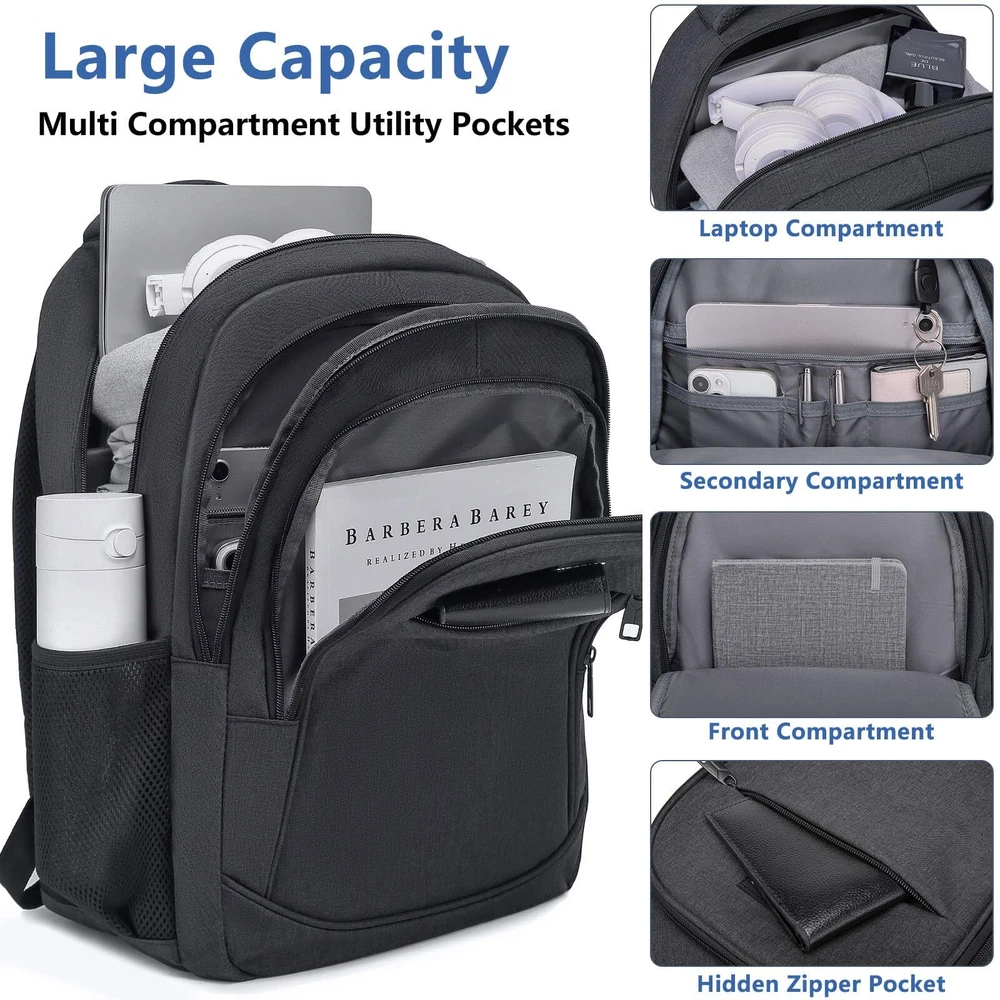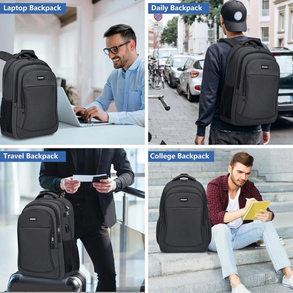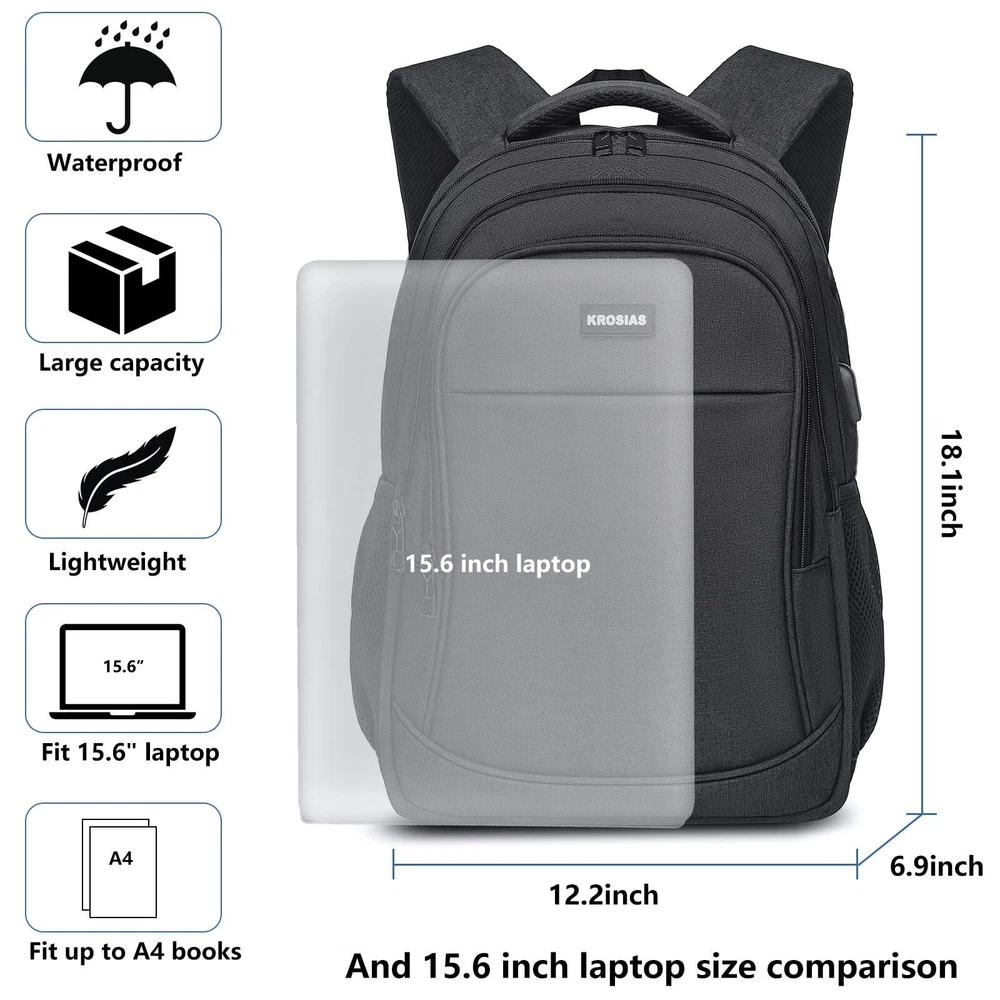 Suitable for various occasions College Backpack, high school backpack, middle school backpack, Business backpack, computer backpack, laptop backpack, office backpack, travel backpack Specifiations Dimensions: 18.1 X 12.2 X 6.9 IN Weight: 1.76lbs Capacity: 35L Department: Unisex Closure Type: Metal Zipper Material: Waterproof Polyester Laptop sleeve with velcro, ideal for 12", 13.3", 14", 15", 15.6" laptops. Guide of Bag's Size 15.6 inch bookbag is ideal for people of height from 4.2ft to 6.3ft. Package Include Backpack x 1 USB Cable x 1 【Large Capacity & Organized】Size: 18.1 X 12.2 X 6.9 IN. 35L. One separate padded laptop sleeve that fits 11 to 16 inch Laptops/Tablet/Notebooks. 3 spacious compartments roomy for clothes, books, iPad, mouse, charger, file folders, etc. Zippered pocket inside make your items organized and easier to find. The Bookbag meets Airline's Requirements, putting it under the seat is allowed. 【Charging and Listening】The Charging backpack with an external charging port & built-in charging cable provides you a more convenient way to charge your electronic device via connecting your own power bank while walking or cycling. The headphone jack gives easy access to earphone usage. 2 ways for you to choose. (POWER BANK is not included) 【Breathable and Ergonomic】Padded and breathable mesh back panel of this computer backpack helps with ventilation, air convection, and heat elimination. Ergonomic design of S-shape padded shoulder straps help relieve the stress of the shoulders. 【Safety and Convenience】Zipper with the metal matte pulls slides easily and smoothly. Luggage sleeve allows the schoolbag to fit on the suitcase, great for international travel or business trips. Hidden anti-theft pocket protect your valuables from stealing. Key clasps and pen pockets are suitable for internal storage. 【Waterproof & Unique】The School backpack is constructed with waterproof and scratch-resistant oxford fabrics for protection in light rain, and features heavy-duty two-way zippers on both sides of the backpack for easy access. Ideal for weekend getaways, shopping & outdoor activities in daily life. Our laptop backpack is a good choice for Students. (Age: over 3 years old)