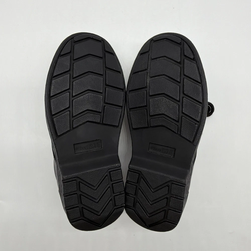 These School Issue Shoes are perfect for boys in size US 11.5W. Made with a black leather upper in Thailand, these slip-on shoes feature a closed toe design with a drawstring closure and lace accents. The rubber outsole provides durability, while the adjustable features make them comfortable for all-day wear. Ideal for occasions like travel, formal events, or christenings, these shoes have a solid black color with a leather lining and insole for quality and style. Perfect for young boys looking to make a fashion statement in a formal setting. Check pictures for flaws and measurements