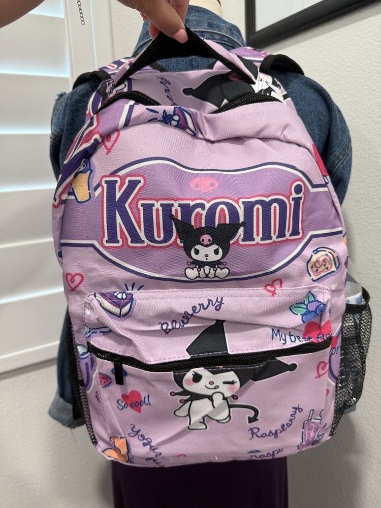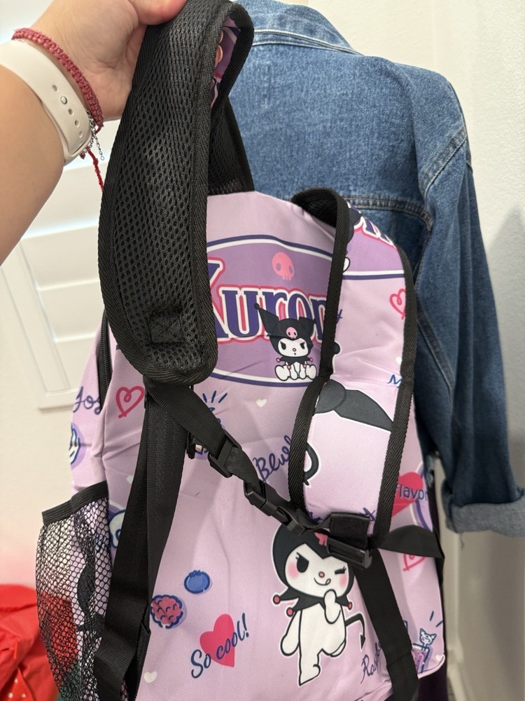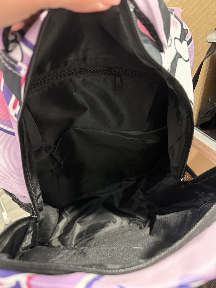 The School Sized Kuromi Backpack School Bag is a large, multicolored backpack featuring a zipper closure and shoulder strap handle style. Made of canvas with inner pockets, this unisex kids backpack is perfect for travel and casual occasions. With a cute Hello Kitty character theme, this stylish backpack is a great choice for school and everyday use. The polyester shoulder strap adds durability and comfort for easy carrying.