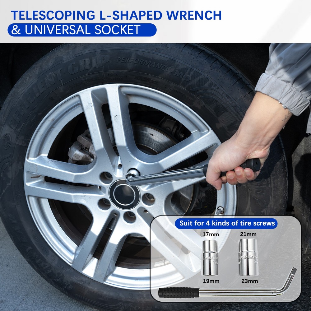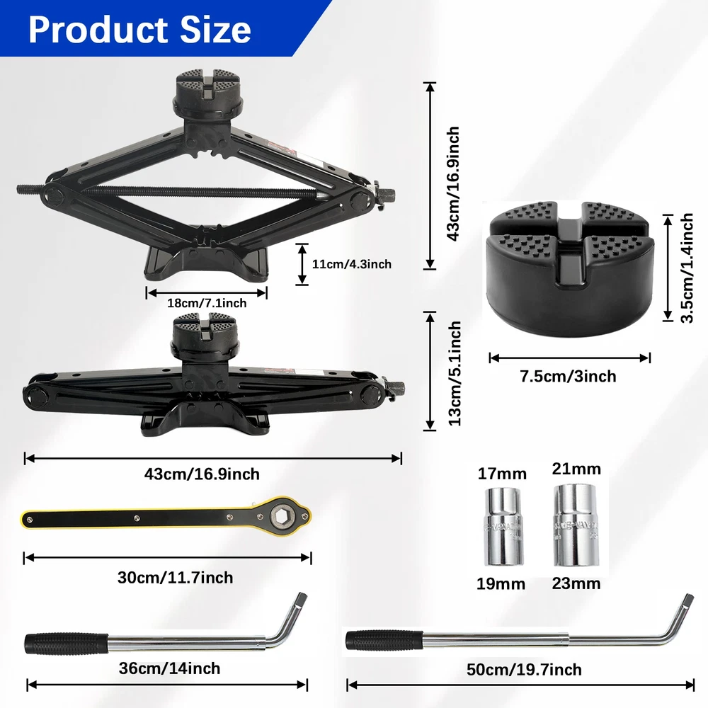 Scissor Jack Features: Main function is for lifting vehicles or motorcycle and repair them. Easy to operate using with speed handle. Large base and saddle helps provide stability Easy to use and to operate at affordable prices Compact size for storage. Ergonomic design for comfortable handling. Scissor Jack BEFORE USE: 1. Do not use blocks on or under the jack. 2. Check before each use for abnormal conditions such as cracked welds, leaks, damaged, loose or missing parts. 3. Inspect the jack immediately if the lift is believed to have been subjected to an abnormal load or shock. 4. If the jack is found to be damaged, it should be removed from service until properly repaired. Scissor Jack OPERATING INSTRUCTIONS: 1. Insert the jack handle into the hole of the handle socket. 2. Make sure that the saddle is correctly positioned. To prevent damage to the jack, do not move the jack while the handle is intact in the socket. 3. To raise load, use one hand to hold the front part of the handle and use the other hand to turn at the rear and of the handle clockwise. 4. To lower load, use one hand to hold the front part of the handle and use the other hand to turn at the rear and of the handle counterclockwise slowly. Scissor Jack Specifications: Color:Black Condition: Brand new Minimum height: About 110mm Maximum height: Approximately 400mm Lifting Capacity:3 Ton Material: Steel Item Size: 44*11 CM Extendable Wrench Features: STURDY AND PRECISE CONSTRUCTION: Provides more torque than a standard lug wrench CONSIDERATE EXTENDABLE DESIGN: Provides extra leverage required for removing even the tightest wheel nuts 2 REPLACEABLE STANDARD SOCKETS: Fits most cars and trucks wheel replacement work NON-SLIPPING SLEEVE: At the end of the handle attaches a non-slipping sleeve which allows you to grip the handle tightly and comfortably when you are working Extendable Wrench Specifications: Material: Chrome-Vanadium Steel Socket Type: 17/19mm, 21/23mm Extending Range: 33cm-49cm Package Included: 1 x Scissor jack 2 x Rubber pads 1 x Handle 1 x Telescoping Lug Wrench 1 x Socket (17/19mm) 1 x Socket (21/23mm) 1 x Storage bag 1 x Gloves