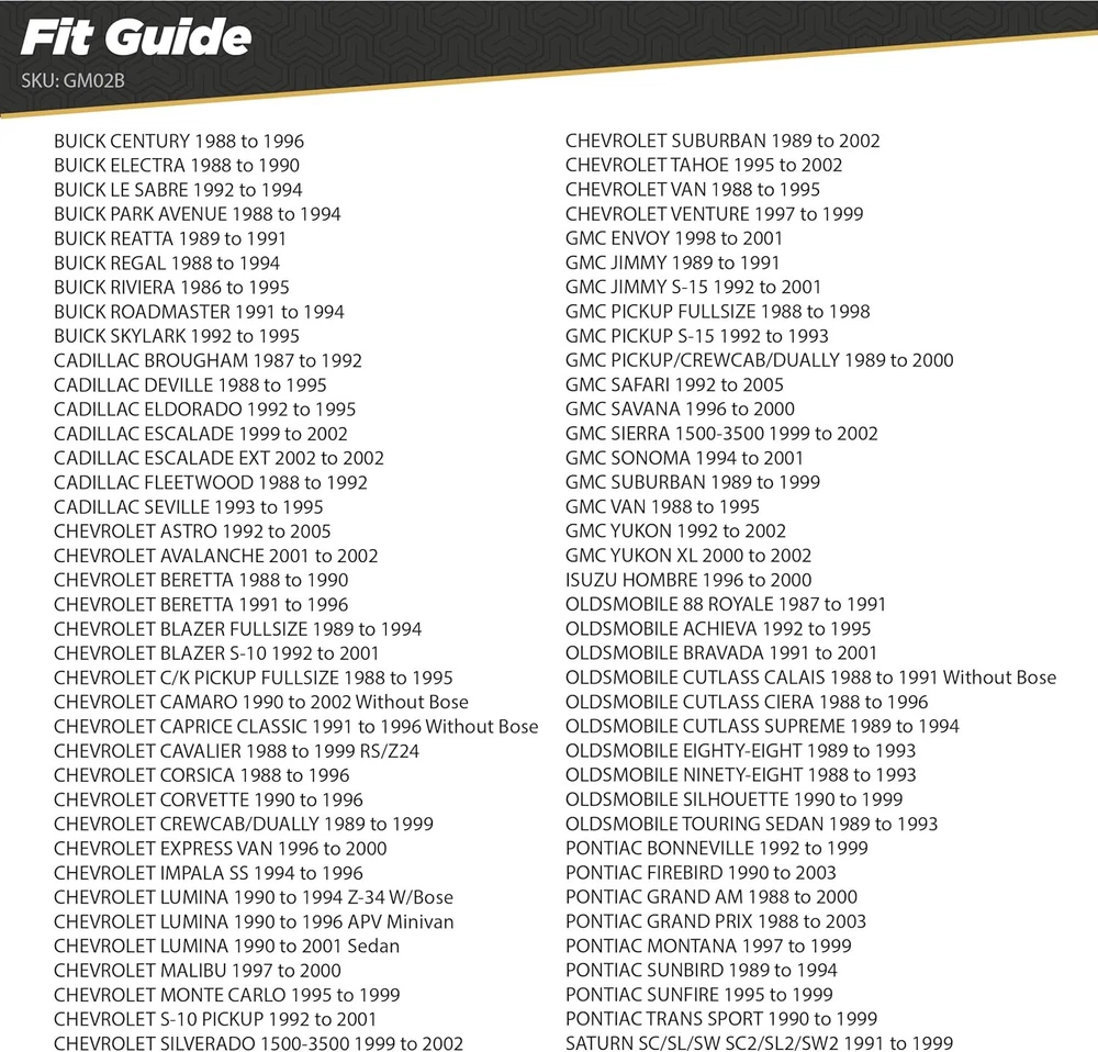 Scosche GM02B Compatible with Select 1986-05 GM Mini Power/Speaker WHITE Product Details Brand: Scosche Material: Plastic Item dimensions L x W x H: 6 x 2 x 50 inches Item Weight: 0.1 Grams Cable Type: Multi-Pin Connector Type: Multi-pin Recommended Uses For Product: Audio Manufacturer: Scosche Product Dimensions: 6 x 2 x 50 inches Item Weight: 0.004 ounces Item model number: GM02B Is Discontinued By Manufacturer: No Special features: Lightweight Other display features: Car Audio or Theater Color: WHITE Whats in the box: Wiring Harness and Manual Department: Electronics > Car Electronics > Installation Accessories & Harnesses > Radio Wiring Harnesses Country of Origin: China Convenient Solution - Scosche GM02B Radio Installation Harness allows a new aftermarket radio to be installed in Select 1986-2005 Buick, Cadillac, Chevrolet, GMC, Isuzu, Oldsmobile, Pontiac and Saturn Vehicles vehicles using the factory radio harness. Precision Fit - See Fit Guide and Notes in images to verify that your vehicle is compatible with this harnesses. Some vehicles have limited compatibility based on the trim level. Not compatible with Factory Amplified systems. Easy Installation - This wire harnesses for car radio installation is designed to simplify the process of replacing your factory radio with an aftermarket radio using the existing wiring and connectors without cutting any factory wire. Superior Quality - Made to last, this wiring harness is crafted with factory quality materials, ensuring a safe and secure connection for long-term performance. Industry Compliant - EIA industry standard color coded wires for an easier installation. Each wire is individually labeled for easy identification and Pre-Terminated Butt Connectors for a quick installation.