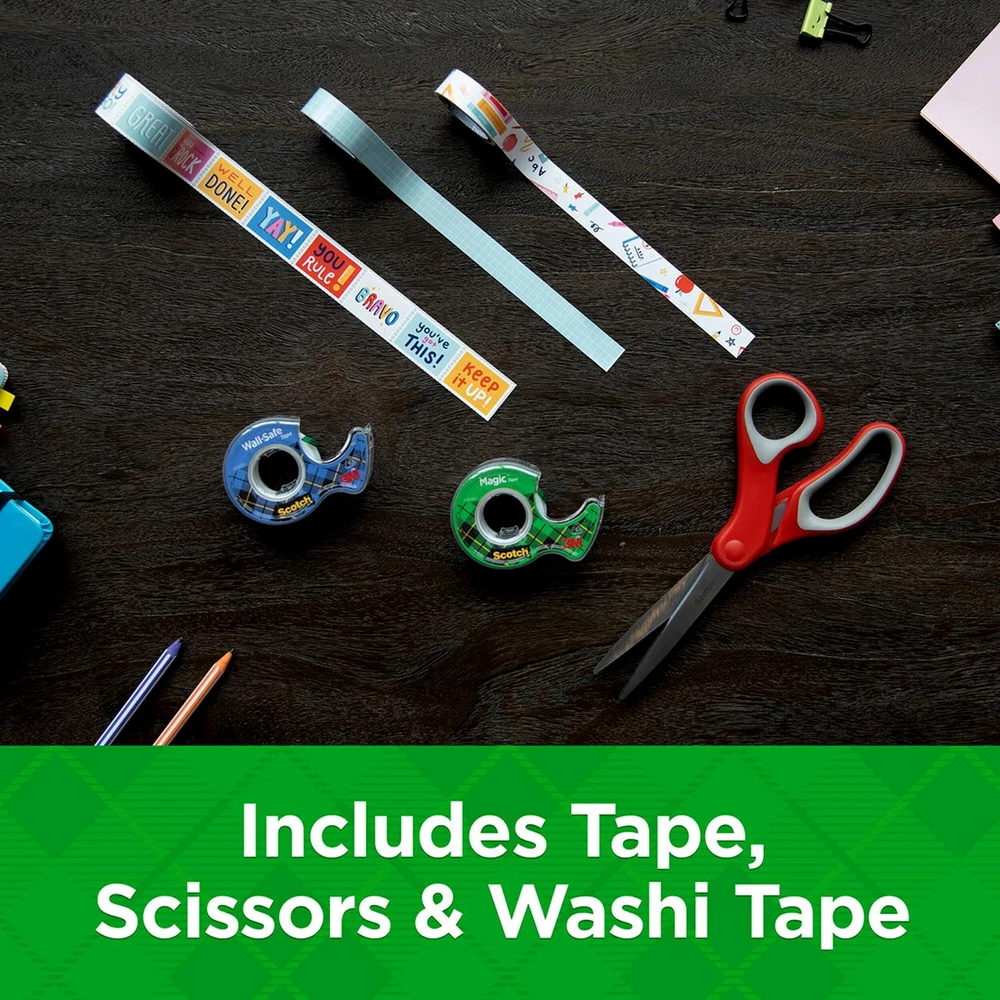 KIT,BACK,TO,SCHOL,PCK,AST About Us Payment Info Shipping Info Customer Support Feedback Scotch Back To School Pack Assorted Tapes Plus Scissors/Kit BTSPKSCOTCH-21 Brand: 3M UPC: 0638060923047 Mfr Part #: BTSPKSCOTCH21 Scotch? Back To School Pack Start the school year off right with this kit that includes one roll each of Magic Tape and Wall-Safe Tape, three rolls of Washi Tape--one with grid pattern, one with school icons and one with positive messages, and one multipurpose 8 scissors. Great for teachers to prep for the school year, for student?s projects, and for home schooling. Dispenser Included: Yes; Width: 0.75"; 0.59"; 0.94"; Length: 25 ft; 3.79 yds; Size: 0.75" x 25 ft; 0.59" x 3.79 yds; 0.94" x 3.79 yds. Global Product Type: Transparent Tape Dispenser Included: Yes Width: 0.75"; 0.59"; 0.94" Length: 25 ft; 3.79 yds Size: 0.75" x 25 ft; 0.59" x 3.79 yds; 0.94" x 3.79 yds Color(s): Assorted Color Family: Multicolor Color Assortment: Clear; Aqua/White Grid; Multicolor School Icons; Multicolor Positive Messages Preprinted Message/Format/Border: Grid; School Icons; Positive Messages Product Biodegradability in Days: 0 Package Includes: (1) 0.75" x 25 ft Roll Scotch? Magic Tape; (1) 0.75" x 25 ft Roll Scotch? Wall-Safe Tape; (1) 0.59" x 3.79 yds Roll Scotch? Washi Tape Grid Pattern; (1) 0.59" x 3.79 yds Roll Scotch? Washi Tape School Icons; (1) 0.94" x 3.79 yds Roll Scotch? Washi Tape Perforated Positive Message; (1) Scotch? Multipurpose 8" Scissors Pre-Consumer Recycled Content Percent: 0% Post-Consumer Recycled Content Percent: 0% Total Recycled Content Percent: 0% Store Policies Welcome to the NothingButSavings eBay Store! To make your purchase as easy as possible, NothingButSavings requires payment via PayPal at the time of purchase. We have outlined all of our store policies below, however if you have any questions, please do not hesitate to contact us at any time. Check-Out Now! Click the Pay Now button at the top of this listing to immediately proceed with our checkout and payment process. Please note that the Pay Now button is ONLY available after winning an auction or completing a Buy It Now purchase. Sales Tax Sales tax is applied for shipments to addresses in applicable States where we are required by law to collect and remit sales tax. Purchases are not tax-exempt merely because we are not required to collect a State's Sales Tax. Your State may require you to pay use tax on your purchase. For more information, please visit your State's Department of Revenue or Sales and Use Tax website. Shipping For security purposes, NothingButSavings will only ship to the address provided by eBay at the time of the order. If for any reason this address is incorrect, please contact us as soon as possible to see if other arrangements can be made. NothingButSavings accepts no responsibility for incorrect delivery information contained in your eBay account at the time of purchase. Customer Service If you need to reach us at any time please click here .