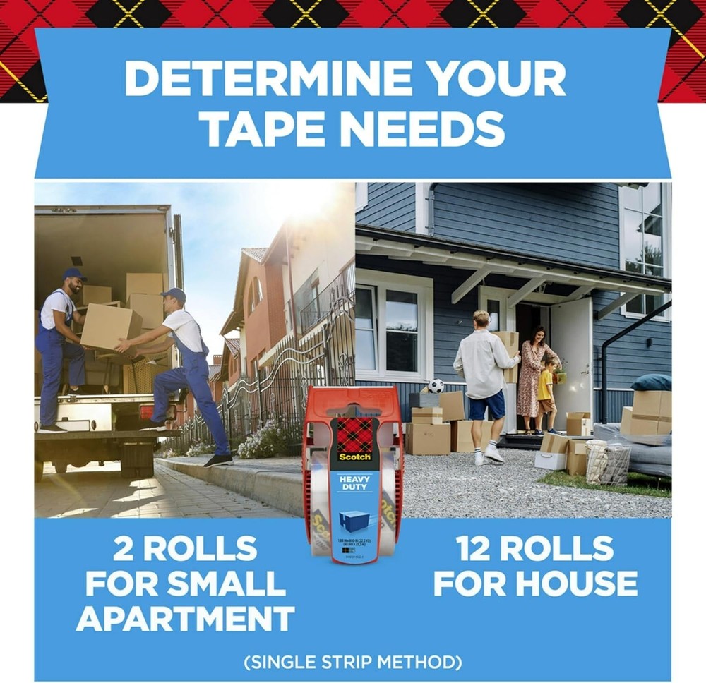 Keep your packages secure with Scotch Heavy Duty Shipping Tape . This 6-roll pack with dispensers provides industrial-strength adhesive that seals boxes instantly and holds up to rough handling. Perfect for moving, storage, or shipping, this tape works on all box types , including harder-to-stick recycled boxes. Features: Heavy Duty Adhesive: Industrial-strength, solvent-free adhesive locks in box contents and resists moisture, dust, and dirt Easy to Use: Each roll comes with a dispenser for precise cutting and hassle-free application Just One Strip Needed: Strong tape resists slivering, splitting, and tearing, keeping boxes sealed with minimal effort Versatile: Ideal for moving boxes, shipping parcels, or packing seasonal items Reliable Brand: Scotch ensures superior quality for all your packaging needs Roll Size: 1.88 in. x 22.2 yd., 1.5-in. core Pack Quantity: 6 rolls with dispensers Perfect for: Home and office moves Shipping parcels Storage and organization Packing seasonal decorations Scotch packing tape Heavy duty shipping tape Clear box tape Packing tape with dispenser Moving supplies tape Industrial strength tape Parcel sealing tape Adhesive shipping tape Item Specifics: Brand: Scotch Type: Packing / Shipping Tape Material: Polypropylene (PP) Size: 1.88 in x 22.2 yd Quantity: 6 rolls Color: Clear Core Size: 1.5 in Recommended Use: Moving, Shipping, Storage Previous page Next page Previous page Next page