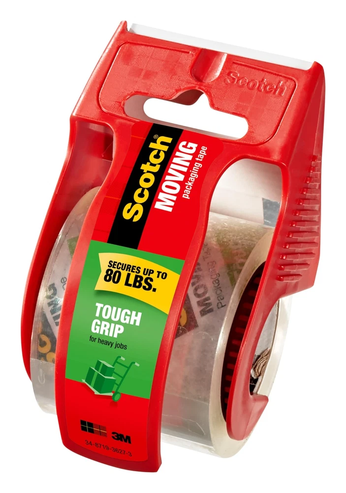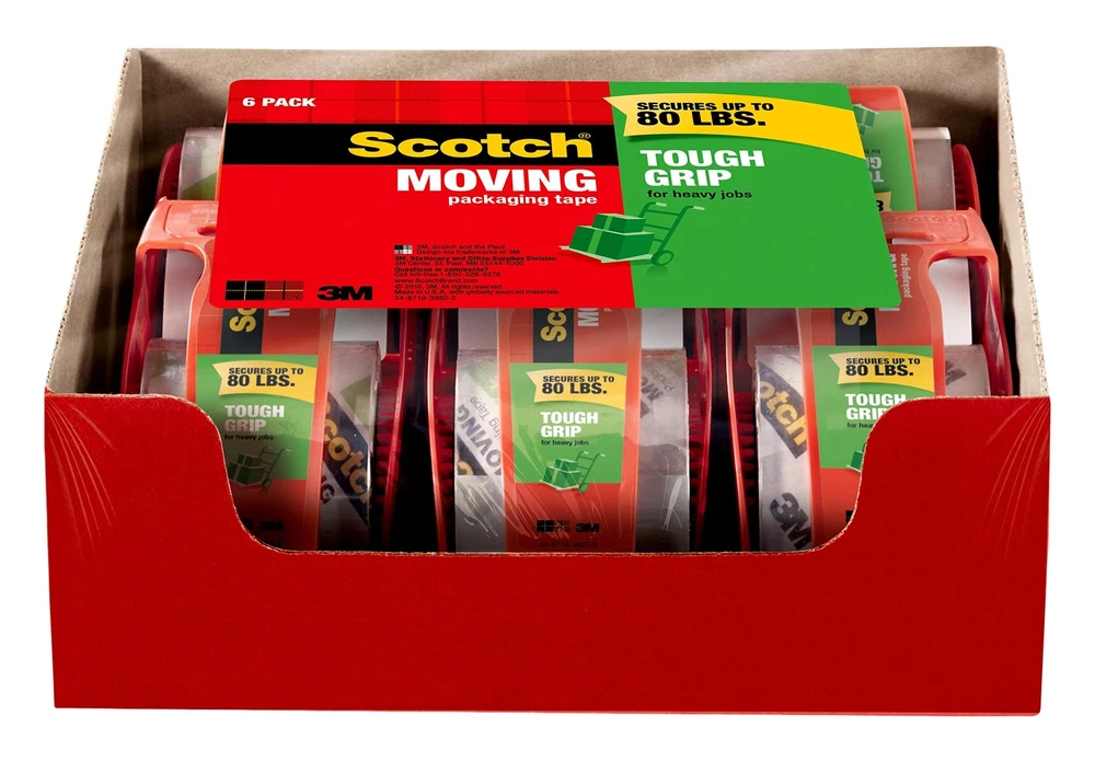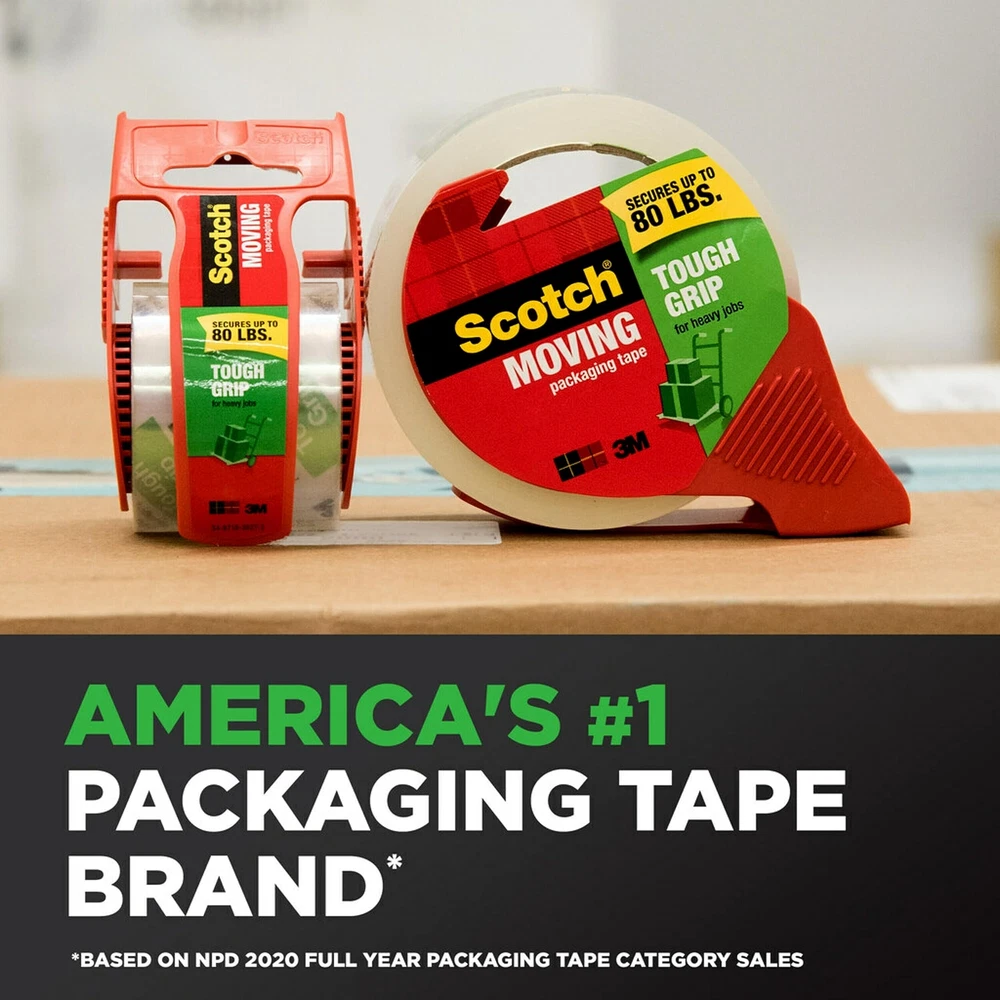 Scotch Tough Grip Moving Packing Tape helps you get a grip on big, heavyweight moving jobs. This moving tape holds strong on all box types, including harder-to-stick-to 100% recycled boxes, and is guaranteed to stay sealed (1). Designed with durable adhesive, this packaging tape secures up to 80 pounds of weight per box, even through rough handling conditions and moving truck rides. When you're packing your belongings for a big move, count on this split- and tear-resistant adhesive tape to ensure boxes stay fully packed and closed. Each roll of box sealing tape unwinds quietly and easily to make application a breeze. Fall-back tabs on the tape dispenser help ensure the tape doesn’t fall back on the roll, keeping it ready to seal the next box. One package contains six rolls of packing tape that are 1.88 in. x 22.2 yd., on a 1.5-in. core, each in its own dispenser. Scotch Brand delivers confidence in superior results to get package protection done well and effectively the first time. (1) If your box does not stay sealed, 3M will refund the purchase price of this tape. Proof of purchase required. Contact: 1-800-3MHELPS MOVING TAPE: 6 rolls of Scotch Tough Grip Moving Packing Tape in dispensers for convenient application offer excellent holding power for your packing and moving needs STRONG ADHESIVE: Durable adhesive easily secures moving boxes with up to 80 pounds of weight inside, even through rough handling conditions and moving truck rides FOR ALL BOX TYPES: Box tape that works on all types of boxes, including harder-to-stick-to 100% recycled boxes, and resists tearing and splitting IDEAL FOR: Clear tape that offers a tough hold on heavy boxes, making it perfect for sealing moving boxes full of items like dishes, books, toys and more QUIET UNWIND: Packing tape features a quiet and easy unwind to ease the task of all-day packing USE WITH TAPE DISPENSER: Dispenser (included) provides precise cuts and has fall-back tabs to help ensure tape doesn’t fall back on the roll, keeping it ready for the next use