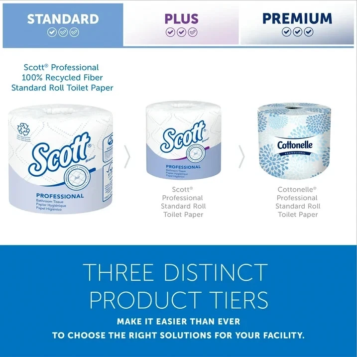 Product details Scott® provides reliable balance of efficiency, performance, and value. As a business owner, quality and cost-effectiveness are important in everything you purchase. With Scott® Professional Standard Roll bulk toilet paper, you can get the quality and performance you count on—and still stay within your budget. With the new paper design, our bath tissue is Unmistakably Scott® branded so you'll be recognized for providing the most well-known restroom brand in your facility. Plus, the bulk rolls are individually wrapped (they're protected until you're ready to use them) and fit with most universal toilet paper dispensers. These toilet paper rolls are designed to fit into universal, cored roll dispensers. If practicality, reliability and value top your list of criteria for bathroom supplies, trust Scott® Standard Roll Bath Tissue! Superior quality at value prices means that Scott® is always a great choice. 473 Sheets/Roll, 80 Rolls of Scott® Professional 100% Recycled Fiber Standard Roll Toilet Paper/Case, 37,840 Sheets/Case, with Elevated Design, 2-Ply, White, Individually wrapped rolls The 2-ply bathroom tissue is strong and absorbent enough to get the job done and satisfy your employees and guests. Individually wrapped Scott® bath tissue rolls are protected until you're ready to use them. These toilet paper rolls are designed to fit into universal, cored roll dispensers FSC® and ECOLOGO® certified; Contains 100% recycled fiber and a minimum of 30% post-consumer recycled content; Sewer and Septic Safe Model Number: 13217