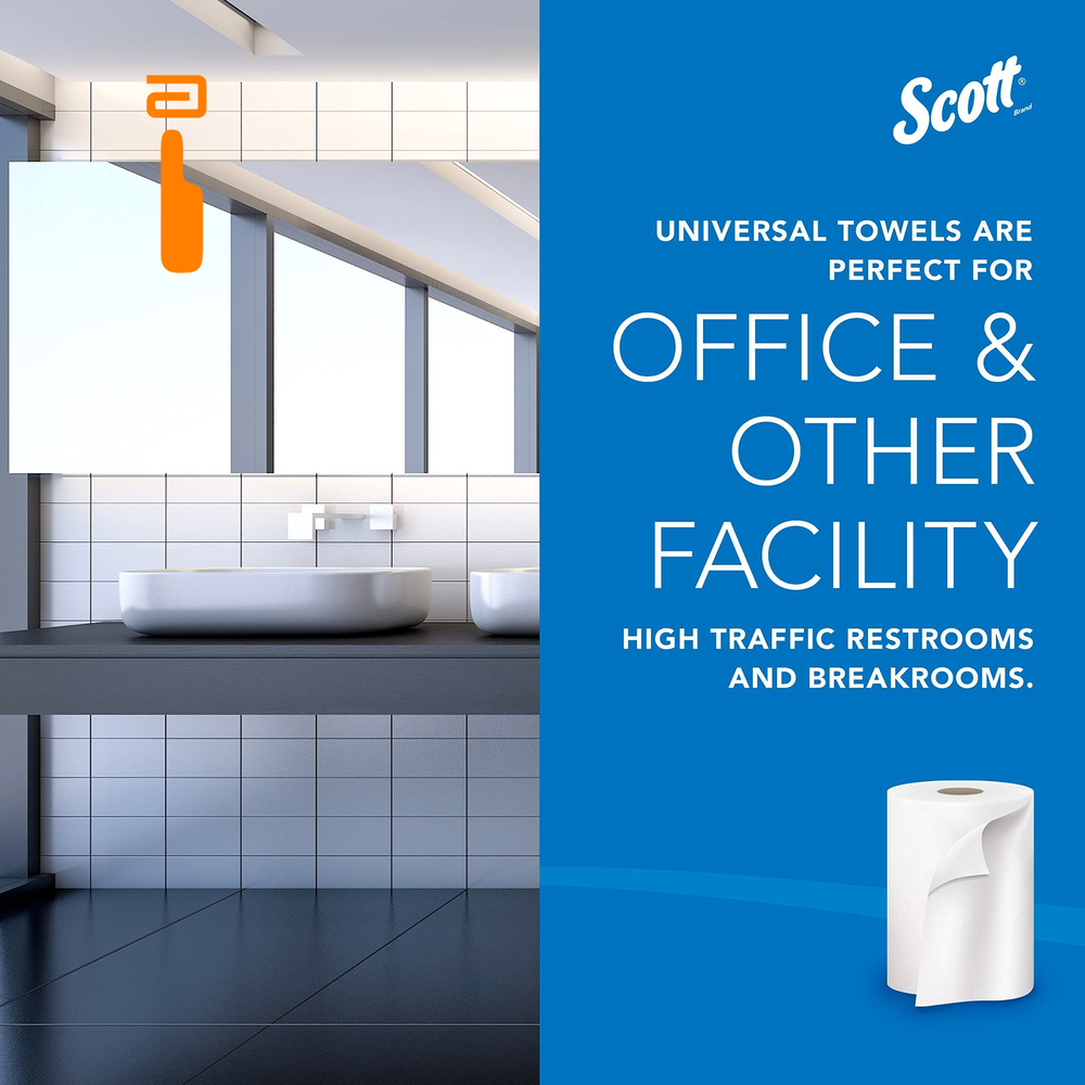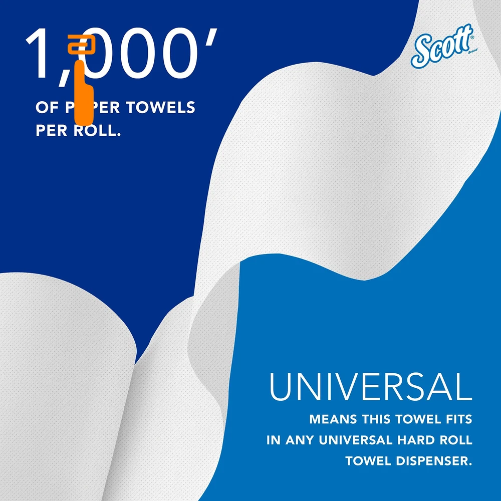 Scott Professional Essential Universal High-Capacity Hard Roll 6 Rolls, White Product Details 1,000'/Roll; 6 Rolls of Scott Essential Universal High-Capacity Hard Roll Paper Towels/Case; 6,000'/Case; with Absorbency Pockets; 1.5" Core; White Reduce maintenance time, run-outs and complaints with long-lasting bulk paper towels (as compared to a folded towel system) Compatible with many Kimberly-Clark Professional universal Hard Roll Paper Towel dispensers, along with many other universal hard roll paper towel dispensers designed to hold 1.5" cores Absorbency Pockets absorb lots of water fast for superior hand drying performance, so guests use fewer paper towels Designed for efficient general-purpose cleaning and drying, saving you money Scott® Hard Roll Paper Towels with fast-drying Absorbency Pockets™ provide efficient, reliable hand-drying for your washroom or break room. If you're looking for high-capacity commercial paper towels compatible with most universal roll paper towel dispensers, Scott® Hard Roll Paper Towels are an excellent choice for your business. Each roll has a core size of 1.5" and is compatible with a variety of Kimberly-Clark Professional™ dispensers and many universal towel dispensers. Scott® Hard Roll Paper Towels are designed to reduce maintenance time, run-outs and complaints. These absorbent recycled paper towels are designed for efficient general-purpose cleaning and drying, so your employees and guests will use less, saving you money.