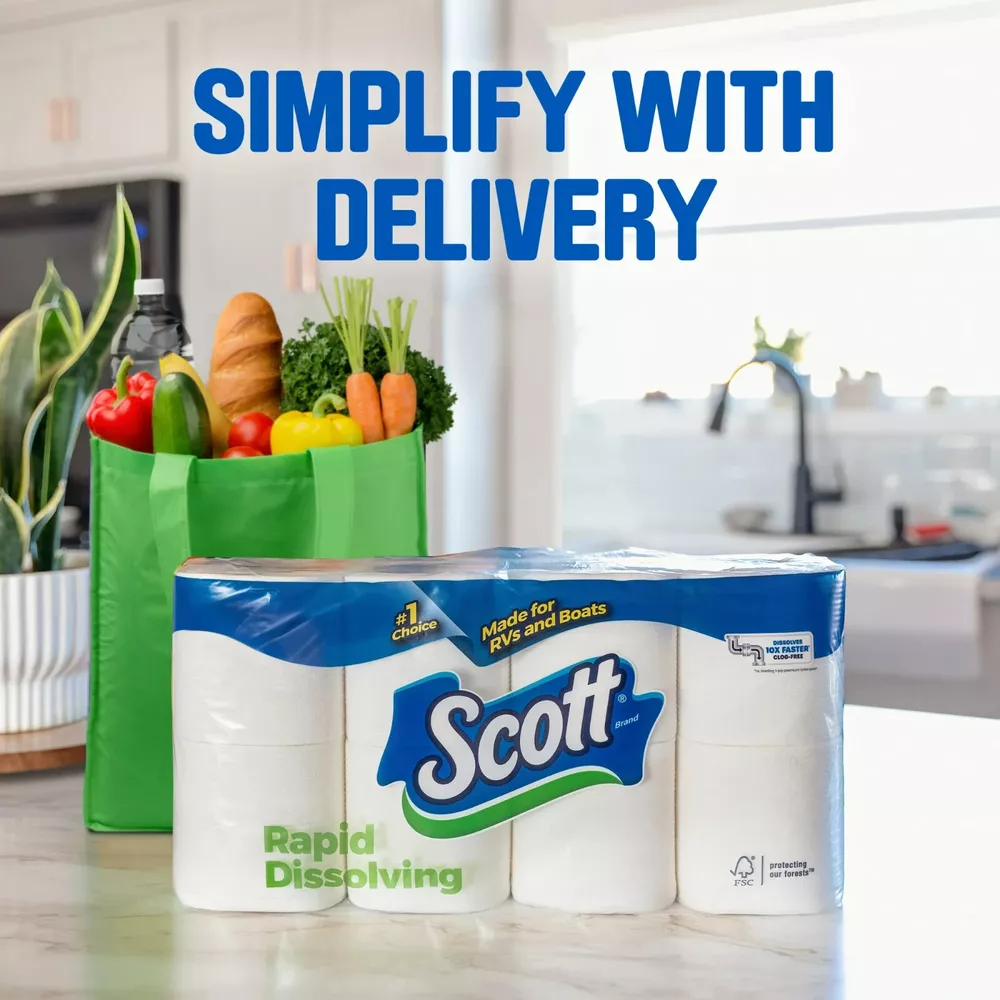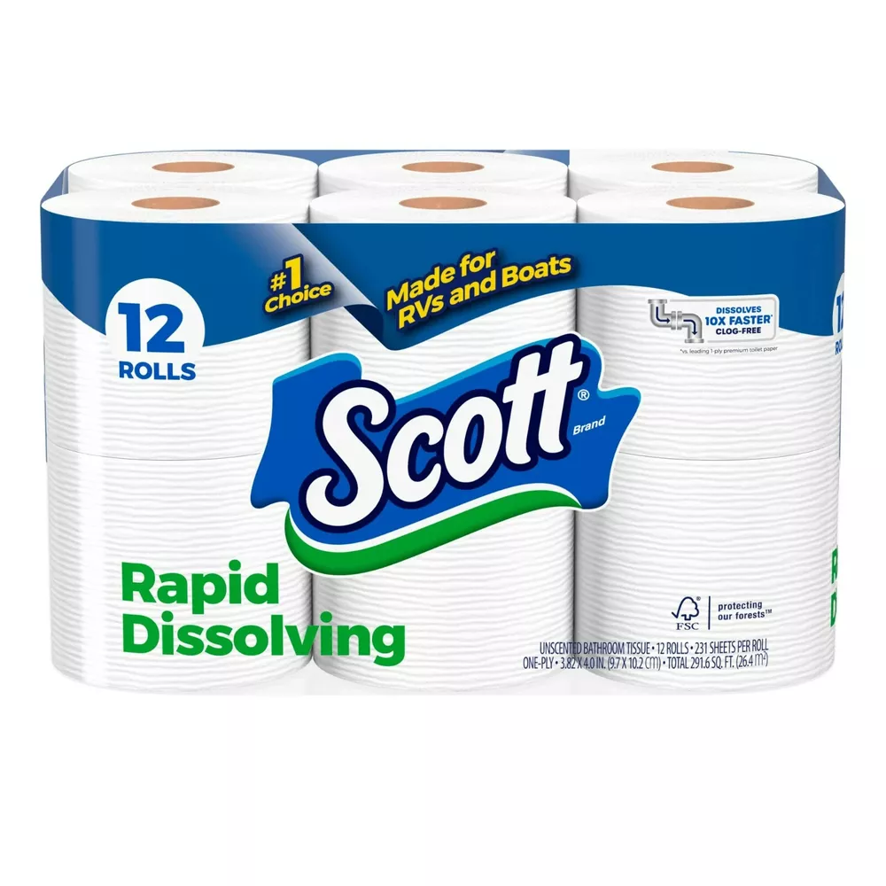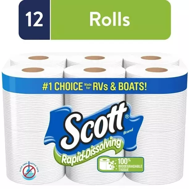 Scott Rapid-Dissolving Toilet Paper for RVs & Boats, 12 Double Rolls Product Description: 12 Double Rolls of Scott Rapid-Dissolving Toilet Paper, 1-ply, 231 sheets per roll; toilet paper that's easy on your wallet, easy on your pipes Scott Rapid Dissolving toilet tissue is the #1 choice made for RVs and boats Clog-Free Technology: Scott 1-ply toilet paper rolls are made with clog-free technology, so it is septic-safe and ideal for low flow toilets Dissolves Quickly: Our bath tissue breaks down 10x faster* so you can flush with confidence (*vs. leading brand’s 1-ply toilet paper) Trusted for Sustainability: Scott is dedicated to help take care of our planet** (**tissue made with responsibly sourced fibers) Scott packaging and product may vary from images shown