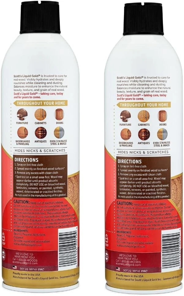 FREE SHIPPING Scott's Liquid Gold Wood Cleaner and Polish, 14 oz, Two Pack About this item Formulated with conditioning natural oils to hydrate and revitalize your wood surfaces, making them feel like new again Designed to protect against further drying and fading of your wood’s finish Hides nicks and scratches Enhances the natural beauty and wood grain of both finished and unfinished wood Fresh almond scent