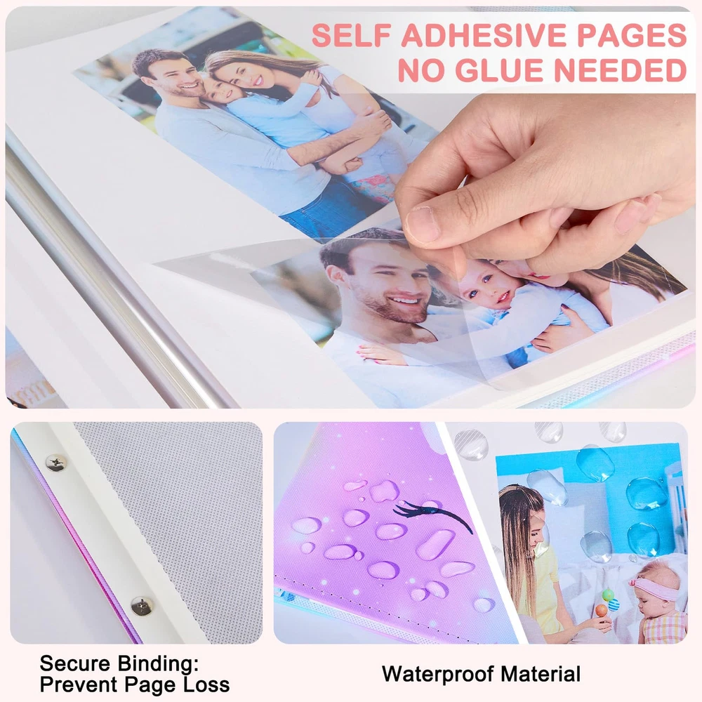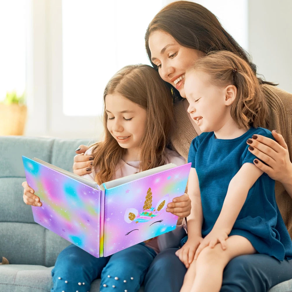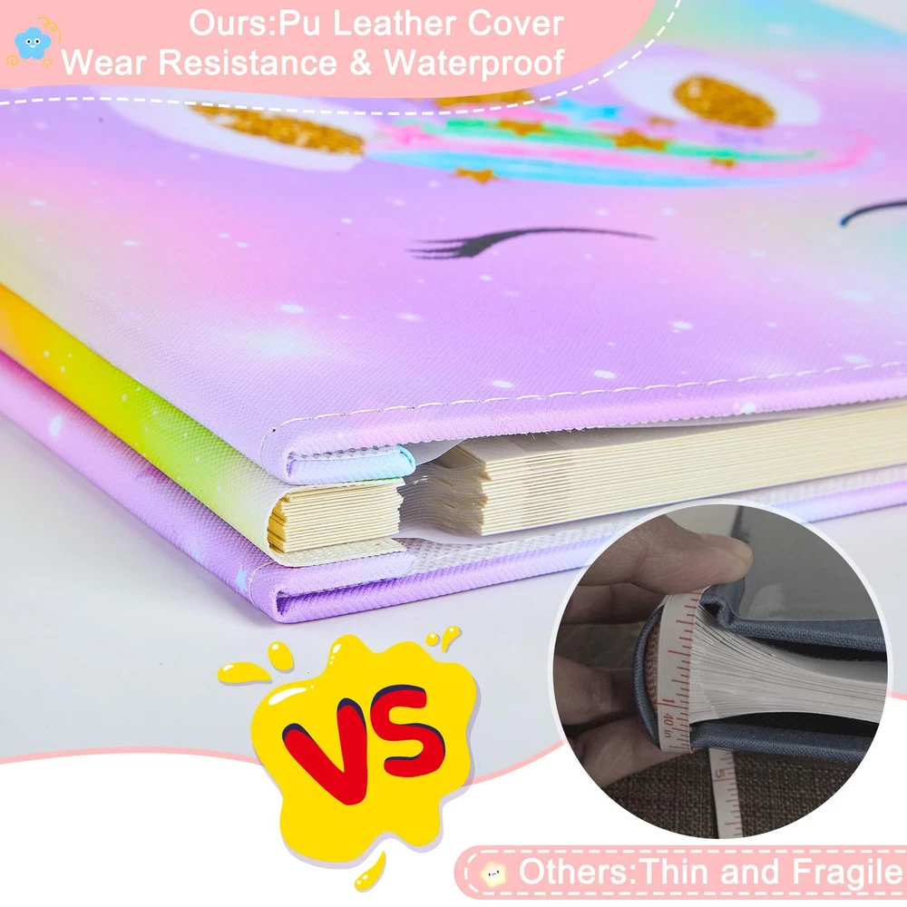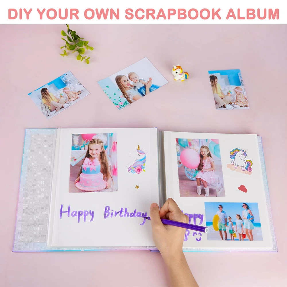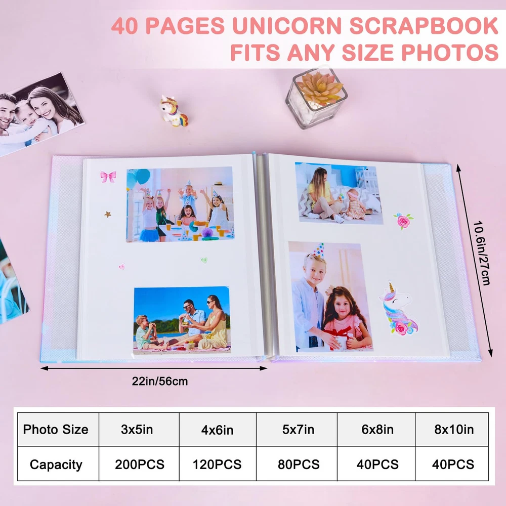 【Cute Unicorn Photo Album】Are you an unicorn-enthusiast or needing a gift for someone who is? The adorable scrapbook is designed with unicorn pattern and vibrant colors, which catch the children's attention, making it an instant favorite among kids, especially for unicorn-loving. Setting the stage for DIY play. Perfect for sparking imagination in children. Cute Unicorn Photo Album: The adorable scrapbook is designed with unicorn pattern and vibrant colors, which catch the children's attention, making it an instant favorite among kids; Setting the stage for DIY; ideal for sparking imagination in children Easier Scrap Book: No more messy glue or sticky tape; Our unicorn scrapbook features a self-adhesive design, allowing for easy arrangement of photos and giving your scrapbook a cleaner, more polished look; Kids can DIY the photo ablum Premiumy Scrapbook : The picture books cover is made of PU leather, wear-resistant and sturdy; Transparent protective film of photo album self adhesive pages keeps your photos fresh; Delaying the life of album and protecting your photos for a long time Multi-size Photo Album: This hardcover picture album 11 x 10.5 in with 20 sheets/40 pages; It can hold 120 photo album 4x6 size photos or various sizes photos including 3x5, 5x7, 8x10. The scrapbook is suitable for all sizes of photos of your memories