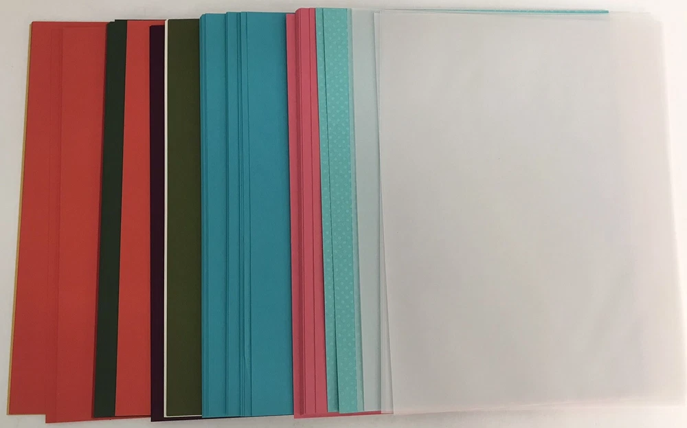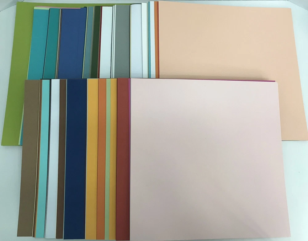 Scrapbook Paper 12" x 12" Lot Of 140+ Sheets & 8.5”x11” 100+ Sheets Solid Colors Includes 142 sheets of 12x12 solid color scrapbook paper, 112 sheets of 8.5”x11” solid color scrapbook paper, plus bonus frosted vellum paper. The paper is a mixture smooth and textured. Please see photos for colors included.