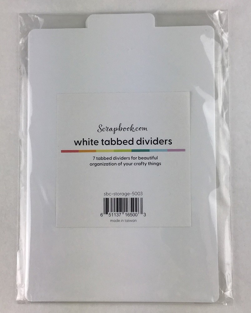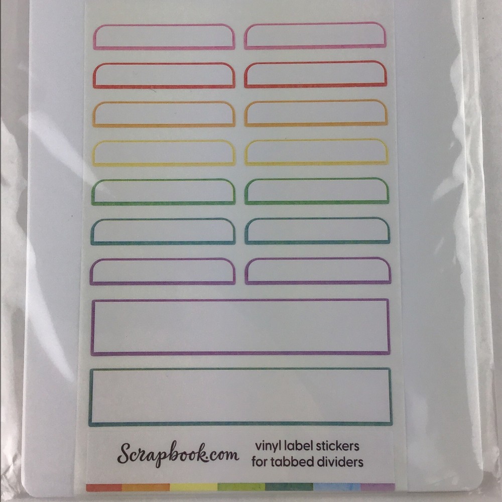 Scrapbook Paper Dividers Vinyl Label Stickers For Tabbed Dividers Package contains 7 white plastic tabbed dividers and 1 vinyl sticker sheet with 16 labels, Dividers measure 5 1/2" x 8 3/8" with the tab. Label sticker sheet measures 4" x 6" New, unopened package.