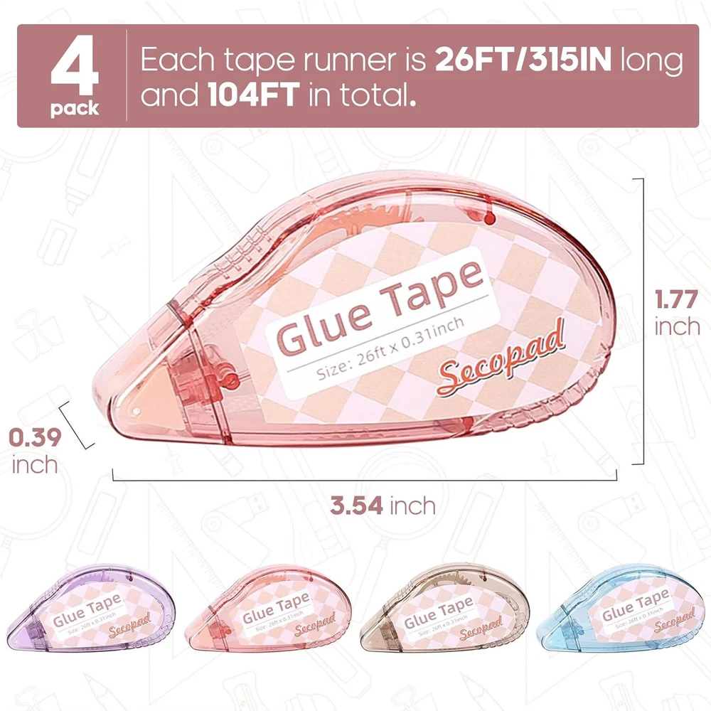 Sticky & Safe to Use: Our double sided tape for crafts was made of high quality glue, it is sticky but not destructive and will help to save your scrapbook or photos for a long time Mess-free & Fast: Different from the ordinary double sided tape or liquid tape, Secopad glue tape won't cause any mess and you don't have to wait for the glue to dry. It takes only a few seconds to finish the work Tape Glue Runner: The compact design and quality material make sure that the glue come out smooth and evenly. 4 Pack two sided tape can be use for home, school and office. It is easy for adults and children to use Alternative to traditional adhesive tape: This tape roller is muti-purpose, you can easily use it for scrapbook,photos, crafts and other arts projects Tip: You can clean and re-tape the scrapbooking tape if you make a mistake in a short time Note: Low temperature may affect the stickiness of the tape, try to use in warm indoors Product Description Better alternative/substitutes to traditional double sided tape and liquid glue One more chance to correct your crafts and scrapbooking Help to make your work, study and life easier