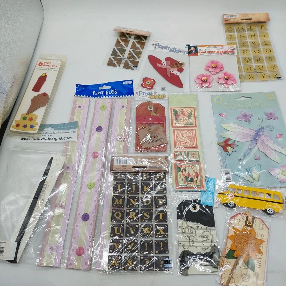 Lot of various stickers buttons letters etc. Includes school bus hearts Butterflies flowers eagle etc