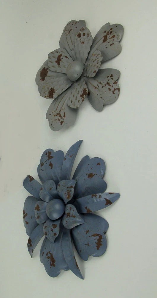This 2 piece set of uniquely beautiful flower sculptures will have your wall blooming with beauty. The metal sculptures are inspired by delicate blossoms you might see in gardens, or maybe even in an open field. Between the delightful flower design and the eye-catching distressed finish in navy, and taupe-grey, they are nothing less than stunning. Use them as part of a table centerpiece or display them on a wall in any direction with other decorative items and create stunning focal point you won't be able to take your eyes off of. Make your walls bloom with visual excitement, this set of 11.5 inch diameter, 1 inch wide wall flowers is perfect for anyone with an eye for the unusual and a modern sense of style. Our eBay Store About Us Add to Favorite Sellers Blue and Grey Metal Art Flower Wall Sculptures Set of 2 OVERALL SIZE - 11.5 Inches in Diameter, 1 Inch Wide Beautifully Sculpted of Metal in a Design that Gives any Indoor or Outdoor Wall a Striking Dimensional Look and Hangs From a Keyhole Mounting Hanger On the Back Beautiful Finish in Navy, and Taupe-Grey with Chipped Paint and Rust Marks for a Wonderfully Weathered Look Use as Part of a Table Centerpiece or Display them On the Wall in Any Direction and Create a Visually Stunning Focal Point Adds a Simply Elegant Burst of Floral Excitement to Any Room This 2 piece set of uniquely beautiful flower sculptures will have your wall blooming with beauty. The metal sculptures are inspired by delicate blossoms you might see in gardens, or maybe even in an open field. Between the delightful flower design and the eye-catching distressed finish in navy, and taupe-grey, they are nothing less than stunning. Use them as part of a table centerpiece or display them on a wall in any direction with other decorative items and create stunning focal point you won't be able to take your eyes off of. Make your walls bloom with visual excitement, this set of 11.5 inch diameter, 1 inch wide wall flowers is perfect for anyone with an eye for the unusual and a modern sense of style. Product Details Color Multicolored Height 11.5 Length 11.5 Weight 1.35 LB