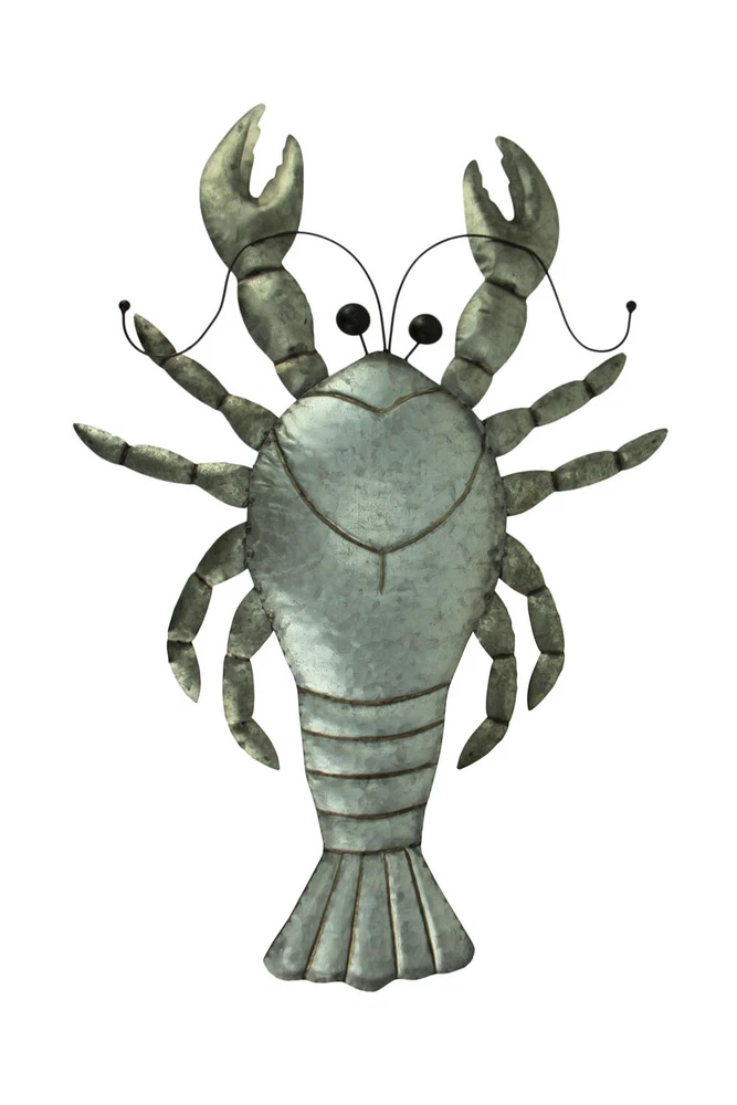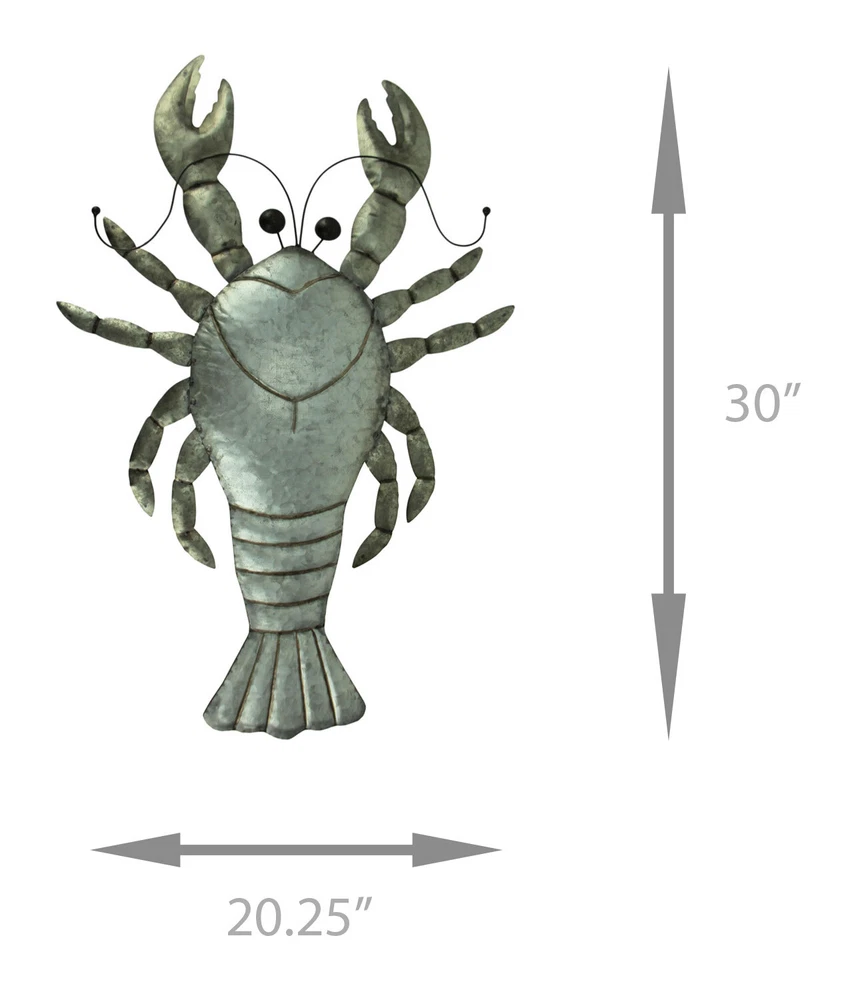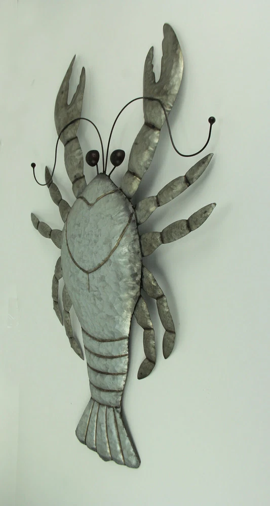 NOTE: DUE TO DENTS IN THE LEGS this item is being sold at a reduced price. Please see last photo for damages/defects. Lobsters are fascinating and beautiful creatures well-known for their unique look with an element of danger with their large claws. Now you can bring their seaside whimsy to your wall with this giant metal lobster featuring a silver-toned distressed galvanized finish that gives it a touch of rustic coastal character full of nautical charm. Whether in the kitchen or in the living room, this 30 inch high, 20.25 inch long, .25 inch wide lobster will make a big splash hanging in your home. Our eBay Store About Us Add to Favorite Sellers Rustic Metal Lobster Coastal Decor Wall Sculpture Large NOTE: DUE TO DENTS IN THE LEGS this item is being sold at a reduced price. Please see last photo for damages/defects. NOTE - DUE TO DENTS IN THE LEGS this item is being sold at a reduced price. Please see last photo for damages/defects. Creativley Crafted of Metal with a Pre-Installed Keyhole Mounting Hanger on the Back Distressed Galvanized Silver-Tone Finish with Blackened Edges Gives it a Rustic Look and a Weathered Patina Brings a touch of Coastal Charm Anywhere that Makes a Big Decorative Impact Hanging Indoors or Outdoors 30 inch High, 20.25 inch Long, .25 inch Wide NOTE: DUE TO DENTS IN THE LEGS this item is being sold at a reduced price. Please see last photo for damages/defects. Lobsters are fascinating and beautiful creatures well-known for their unique look with an element of danger with their large claws. Now you can bring their seaside whimsy to your wall with this giant metal lobster featuring a silver-toned distressed galvanized finish that gives it a touch of rustic coastal character full of nautical charm. Whether in the kitchen or in the living room, this 30 inch high, 20.25 inch long, .25 inch wide lobster will make a big splash hanging in your home. Product Details Color Gray Height 30 Length 20.25 Weight 1.8 LB