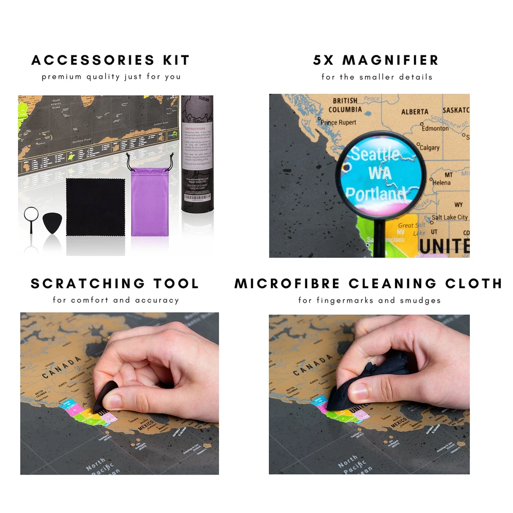Scratch Off World Map Large - Ultra detailed with all U.S States - Accessories Kit and Gift Tube - 70 x 42cm - Deluxe Cartographic design by Atlas&Green Our scratch off world maps for wall poster with detailed united states map are the perfect travel gifts for your family & friends. No need for travel map with pins, scratch off where youve visited to mark your travels with the beautiful large world map wall art with detailed usa map from Atlas&Green! Just right for the traveller in your family or that friend’s birthday. Our scratchable world travel map with detailed map of the united states is cased in an elegant & sturdy gift tube. Wrap our scratch maps of the world if you like but it looks great as it comes. Track your travels by scratching off each country you visit with our giant world map poster scratch art travel tracker with detailed map of usa. Wherever you go, scratch off the gold layer to reveal a world of color underneath. Don’t forget about the continents & detailed maps of the united states too! Just give them a scratch at the bottom of the world map wall decor. We’ve included some capitals on the colored base layer - you’ll have to travel to the country to reveal them! Beautiful art piece of 200gsm microfibre wall map with detailed usa map poster. Brighten up your room by putting your travel map scratch off map of the world with detailed us map for travel up on display - they look charming as they come but especially nice framed in poster frame. Our travel size maps with detailed scratch off map of united states are handy size, just right for your bedroom or as colorful office art, even on a fridge door. The complete Accessories Kit for your wall map of world. The highest quality kit, no expense spared with our travel posters. Light & soft scratching pick, helping you to scratch the geography scratch off poster with ease & precision. Mini magnifying glass to assist with smaller details. Cleaning cloth to rub off residual gold coating. NEW LARGE SIZE – Our new 28 x 17 inch scratch off map is a unique art piece in itself; the focal point of any room and a perfect way of documenting your travels. Our scratch off map of the world is a great way to show everyone what countries you've visited. A great gift for those who love to travel! GEOGRAPHICAL DETAIL – A large world map packed with cartographic detail including all US & Canadian states in different colors. All countries, cities, rivers, island groups and many more geographical details so you can see exactly where you've been travelling on your scratch off world map. ACCESSORIES KIT – Everything you need to keep your world scratch off map pristine - Scratching Pick, mini Magnifying Glass with 5x magnification and ultra soft microfibre Cleaning Cloth, bundled together in our luxury microfiber kitbag. Conquer the world with a satisfying scratch. 100% SATISFACTION – We stand by the high quality materials we’ve sourced from around the world to deliver you the best possible product – if you any issues at all, we’ll endeavour to fix them immediately. THE PERFECT GIFT FOR TRAVELERS - Plan your next vacation, and be sure to scratch off your destination once home. Now go and explore the world with your scratch world map!