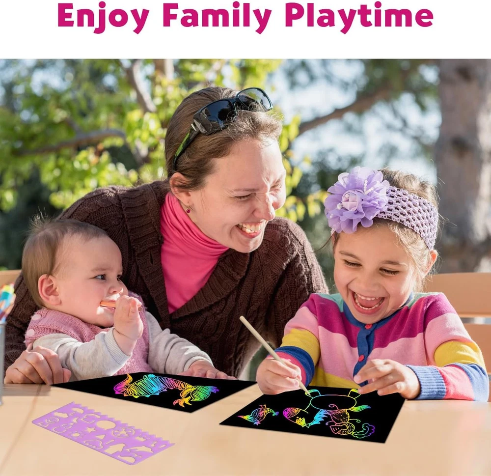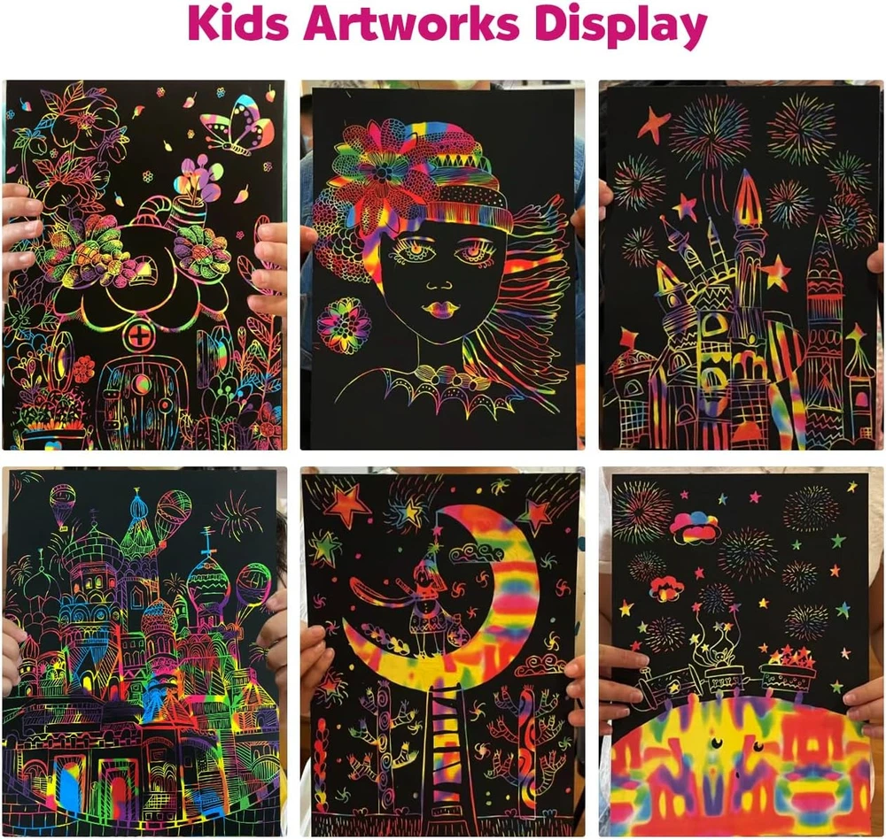 SCRATCH PAPER FOR KIDS: Use the scratcher to scratch away the black matte surface of the paper, revealing the background, so fun plus allows for amazing creative artwork, signs, and more! Makes an excellent arts and crafts activity for kids or grown-up artists EASY TO USE: Scratch paper art products feature bright colors and patterns hidden beneath a matte coating, plus a wooden stylus to reveal them with just a simple scratch. Package including: 50 Sheets Black Scratch rainbow art paper & 5 Wooden Stylus & 4 colorful stencils & 1 brush. Scratch rainbow art sheet size: 7.2 x 5 inch / 18.5 x 12.5 cm (L*W) CREATIVE SCRATCH ART GIFTS: Our scratch art is perfect for 5 year old girl birthday gifts.The arts and crafts for girls comes with an exquisite box, perfect travel toys & car game for kids. Ideal gift for kids birthday, party favors, class activity and Valentine, Easter, Halloween, Children's day, Thanksgiving, Christmas gifts and stocking stuffers INCREASE HAPPINESS: Small pocket scratch notepad perfect for travel and family road trips. Throw it in your backpack, bag or even your pocket and create whenever inspiration strikes. Very good for kids Christmas crafts stocking stuffers gifts for your boys and girls SCRATCH PAPER SUIT ALMOST PLACE: Use for multiple purposes, doodle, jot notes, create cards, sketch, draw, trace and more! The perfect outlet for your children's artistic thoughts Product Description The video showcases the product in use. The video guides you through product setup. The video compares multiple products. The video shows the product being unpacked. ZMLM Foil Art Kit for Kids Customer Reviews 4.4 out of 5 stars 166 4.4 out of 5 stars 166 4.4 out of 5 stars 166 4.4 out of 5 stars 166 4.4 out of 5 stars 166 Price $15.74 $ 15 . 74 $15.91 $ 15 . 91 $15.91 $ 15 . 91 $15.91 $ 15 . 91 $15.19 $ 15 . 19 Theme Princess & Unicorn Christmas Arts & Crafts Planet Space Dress Up Dinosaur & Animal Color Purple Red Blue Pink Green Age Range Kids Kids Kids Kids Kids Number of Foil Sheets 100 Colorful Foil Sheets 100 Colorful Foil Sheets 100 Colorful Foil Sheets 100 Colorful Foil Sheets 100 Colorful Foil Sheets Mess Free ✔ ✔ ✔ ✔ ✔