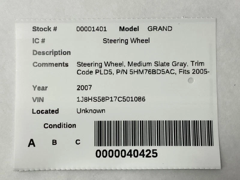 Hollander Welcome to our eBay store! Steering Wheel Gray Fits 2005-2007 Jeep Grand Cherokee 82567 *Scratched and Worn Description This listing is for a used Steering Wheel. The part pictured is the actual item you will receive, no other parts are included. This steering wheel is scratched and worn. Please see part fitment information below and please match part numbers before buying this item. If you have any questions please let us know. Donor Vehicle Model : CHERGRAND Year : 2007 Mileage : 106000 (0 = not available or unknown) Stock Number : 001401 Notes : STEERING WHEEL, MEDIUM SLATE GRAY, T 11425 This Part Will Fit These Makes And Models With These Options About Us Payment Shipping Returns Warranty About Us Please contact us with any questions BEFORE purchasing. If you are unsure if this part will fit we are happy to verify fitment for you prior to purchase via your vehicle's VIN (Vehicle Identification Number). We try to answer all messages in 24 hours. Please note that orders are sent to the shipping department throughout the day therefore we cannot guarantee adjustments to orders after payment is received. Our hours of operation are: Monday - Friday 8:00AM - 5:00 PM CST Saturday - Sunday Closed Payment All orders must be paid in full prior to shipment. Payments are processed through eBay. We accept credit card and cash for Local Pickup orders. If payment is not received, an Unpaid Item case will be opened for the sake of seller fee reimbursement. Sales tax will be collected by eBay where applicable. Shipping We ship items via UPS, USPS, or LTL Freight Carriers. Tracking information is uploaded to the order once the item is shipped. Larger items such as Engines, Transmissions, Doors, Tailgates, Trunk Lids, Rear Axles etc. will ship via freight. Freight items are unable to be shipped until we have all the necessary information required by the carrier. Typically that includes a valid business name, address, valid phone number, and hours of operation. Be sure to provide us with all necessary contact information with your order as well. Freight charges are for zoned commercial addresses with a forklift or loading dock. If the location requires the assistance of a lift gate there will be an additonal fee. If a commercial address is not able to be provided we can ship the item to your residence for an additional fee. Add $100 for Residential delivery Add $85 for Liftgate delivery Most orders are shipped within one business day. If there is an issue with your order or item we will reach out to you before we ship the order. Once payment is received for a freight item we will send a message asking for additional information needed for the freight carrier. Without this information we will not be able to ship your item. If a USPS or UPS item is damaged during shipping please keep all packaging and loose parts complete with the package. Send us a message through Ebay with some pictures and your invoice number. We will work on getting a replacement item to you while handling the UPS claim as well. Please Inspect all freight shipments before signing for them at time of delivery! If there has been any damage to the item during shipping inspect the item to see if you can still use it or not. If you can still use the item, notate the damage on the delivery ticket that the driver is keeping then hand it back to them. Send us a message with a copy of your receipt and the delivery ticket you kept. We will take care of the damage claim with the freight carrier. If you cannot use the product simply decline the shipment send us a message and we will work on getting a replacement or refund to you. It is very important to not sign for any damaged product without notating it on the delivery ticket or denying the shipment. You have the right to inspect the package for obvious signs of damage prior to signing and accepting the delivery. If a delivery driver is refusing to let you inspect the shipment before you sign for it, do not sign, refuse the shipment and contact us through eBay messaging. When you sign for the delivery on the carrier's Bill Of Lading (BOL) it is accepting the merchandise as is and in good order. So please inspect your package before signing for it. We do understand that sometimes there will be damage that is missed, don’t worry we will still be able to help you. If you do find concealed damage after you sign for the package let us know through messages and send some pictures as well. We will get with the freight company and start a claim. We are not responsible for any delays incurred by the shipping company. No International shipping is available outside of the eBay Global Shipping program. We do not ship to PO Boxes, Hawaii, Alaska, Puerto Rico, APO, FPO, AA, AE, AP and U.S. Territories outside of the continental U.S. International orders are shipped via eBay’s Global Shipping Program. Customer pickup at our location is also available. Please contact us prior to your purchase to arrange pick up. Returns If you need to return an item for any reason please contact us first to obtain a RMA number (Return Material Authorization). All returns must be authorized by us before being shipped back. Any items returned must include an RMA number clearly written on the side of the packaging. If you are returning a part because you bought the wrong one or no longer need it the original shipping charges are not refunded and you are responsible for the return shipping. All returns must be made within 30 days of the date of purchase. All parts must be returned in their original condition to receive full credit Once you obtain an RMA number, ship the item back to: Frontier Auto Parts, 2199 Ranger Hwy, Weatherford, TX 76088 Warranty All parts we sell through eBay Motors come with a 30-day warranty and a 30 day return period unless otherwise stated. No labor warranty is provided. In the event a part sold with a warranty fails to operate within the warranty period we will replace the part(s) with a fu