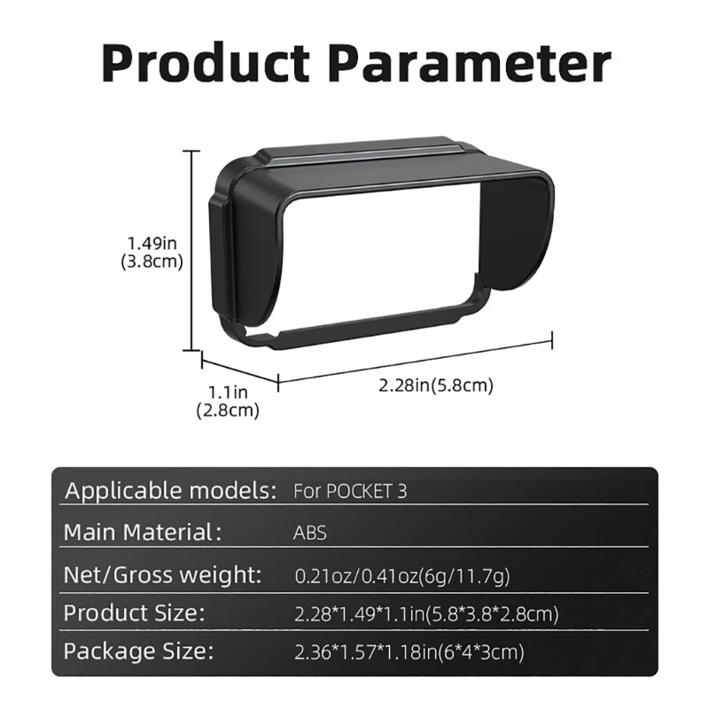 Screen Protective Cover For Pocket 3 Anti-Scratch Gimbal Camera Sunhood Guard Features: and high This screen shade is specially designed for Pocket 3 camera, effectively reducing sunlight reflection and providing clear visuals. Crafted with high silicone material, this lightweight and portable accessory is and remove. for photography enthusiasts and vloggers who enjoy outdoor shooting. Suitable for various outdoor shooting scenarios such as landscapes, sports activities, and live performances. It does not affect the sliding of the display screen of camera, and is small, light and convenient to carry. Specifications: Silicone Size:Approx.5.8x3.8x2.8cm/2.28x1.49x1.1inch Package Includes: 1x Sunshade Cover note: 1.Please allow 1-2cm errors due to manual measurement, make sure that you do not mind before you order. 2.Due to the difference between different monitors, the picture may not reflect the actual color of the item.
