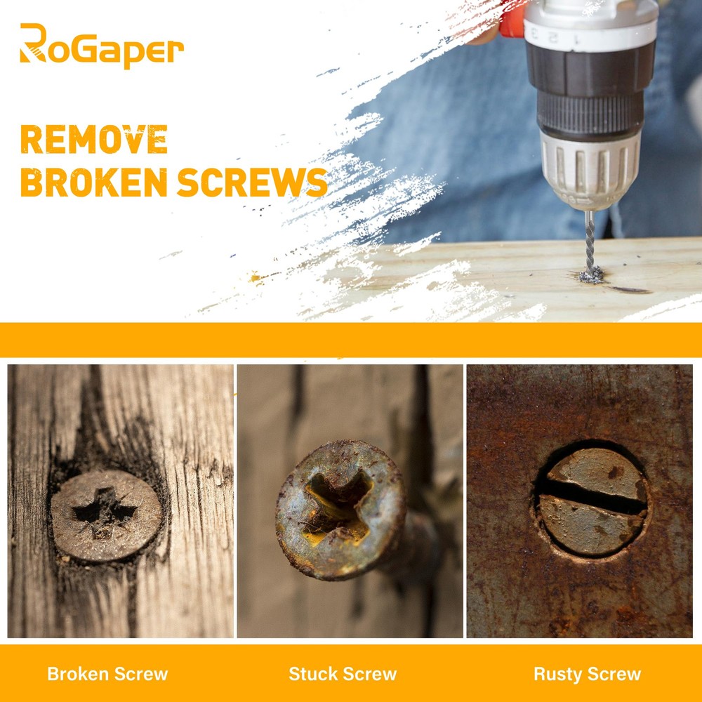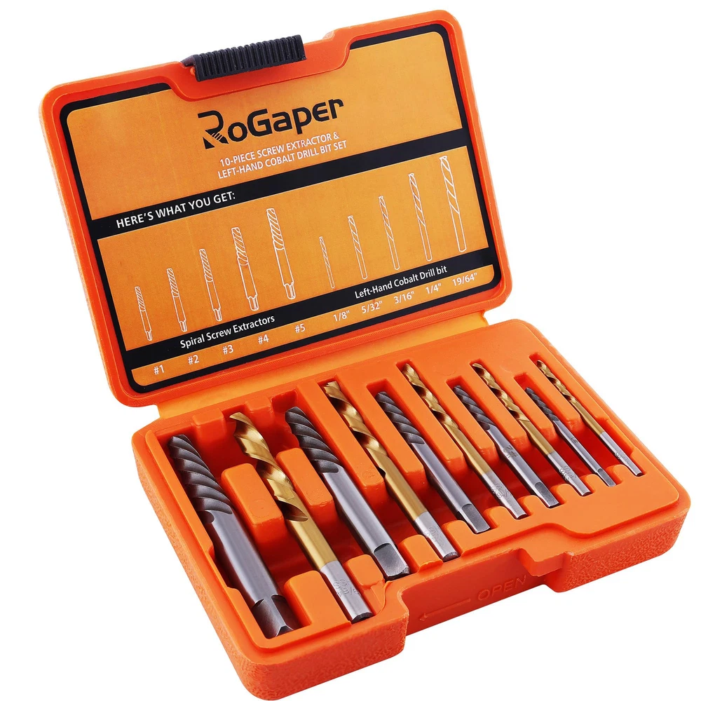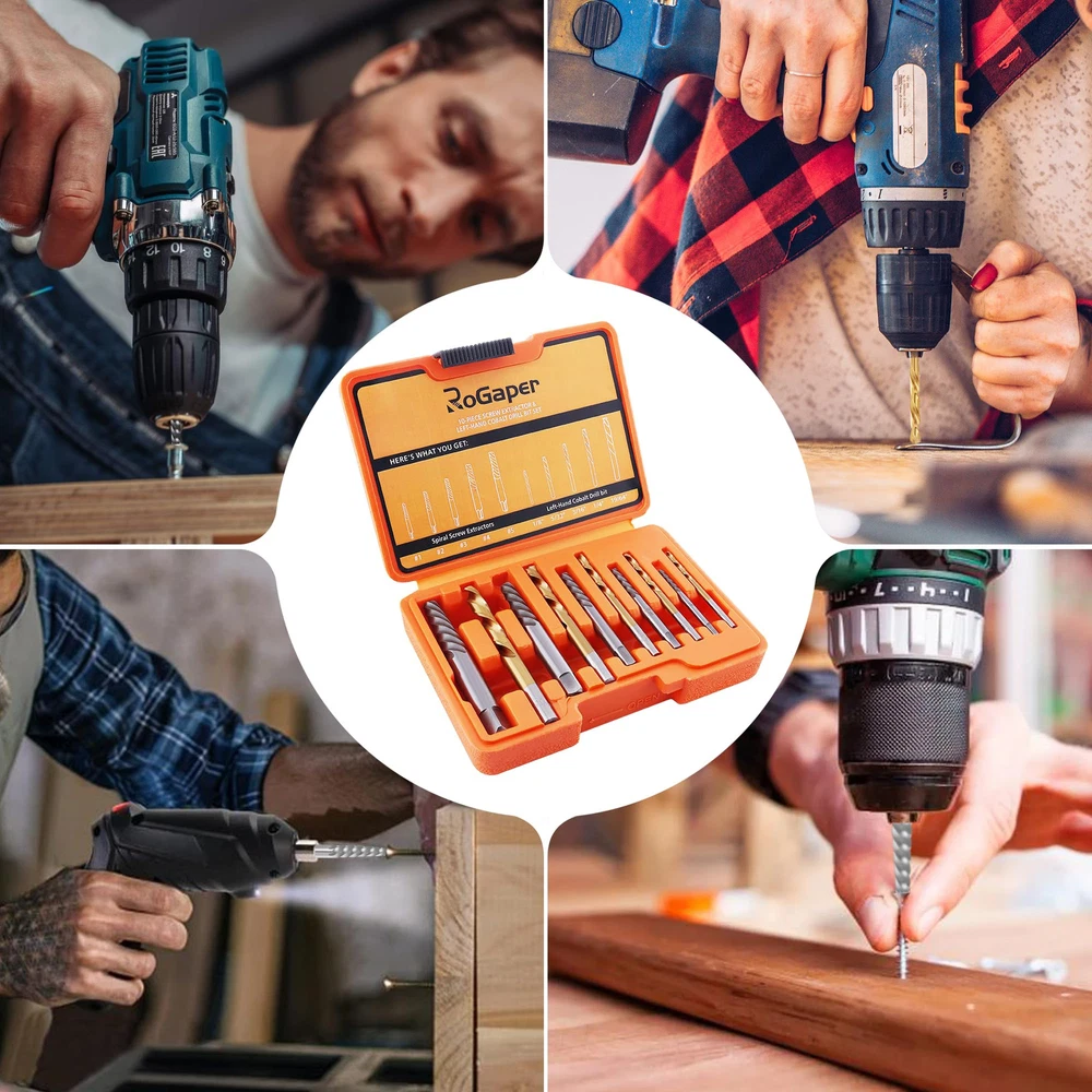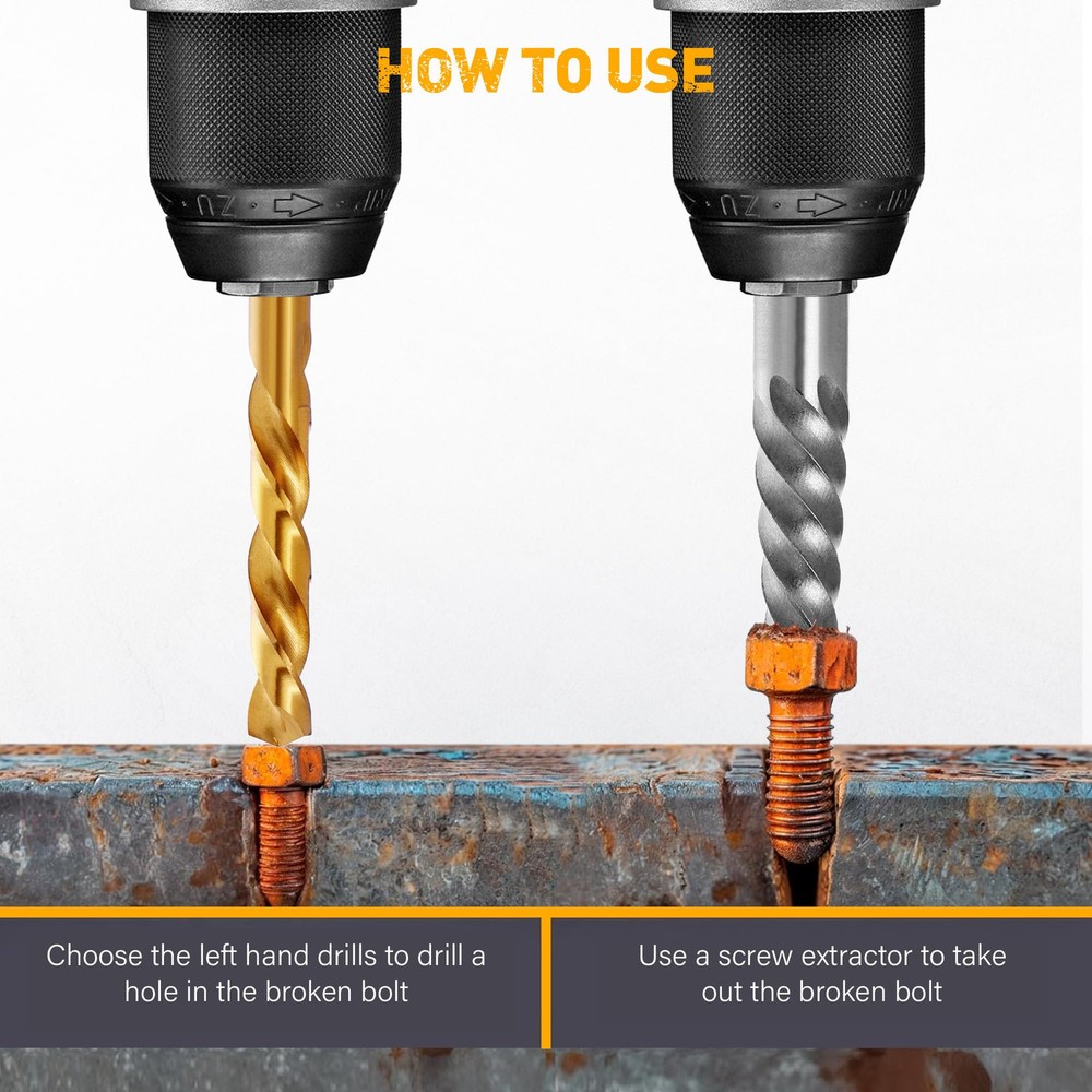 Save Time and Effort: Extraction bits easily remove broken screws, studs, bolts and other fittings effectively. Stripped bolt remover and extractor works on seized bolts, broken fasteners, and commonly called an easy out MULTI-PURPOSE: Bolt extractors that remove broken screws, whether working on wood or metal, are ideal for construction, automotive, home DIY projects or for industrial use. High and Resistant Material: Left-hand drill bits are made from cobalt-fortified high-speed steel for increased durability and service life. The 135° angle design of the head makes it easier to touch the fasteners Multiple Sizes: 5pcs #6542 HSS left-hand drill bits and 5pcs #37 alloy steel bolt extractors. Left-hand bits / reversed drillbits - 1/8", 5/32", 3/16", 1/4", 19/64" and Matching Alloy Extractors (stud outs) - 1#, 2#, 3#, 4#, 5# in a portable storage case that provides excellent protection and against lost screw extractors QUALITY COMMITMENT: Add cutting oil or spray water to cool during continuous use, any quality problems, please us.
