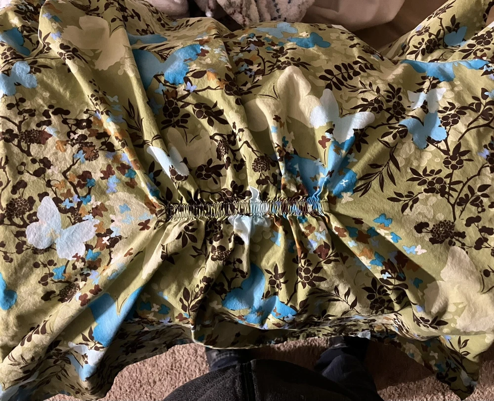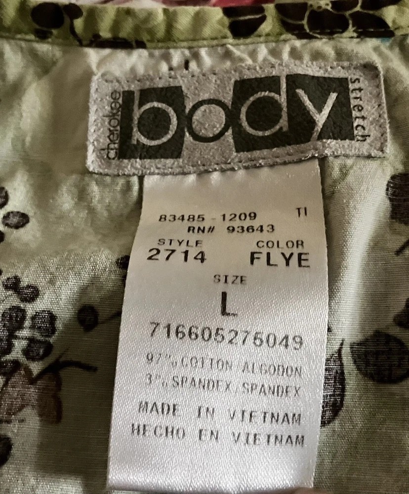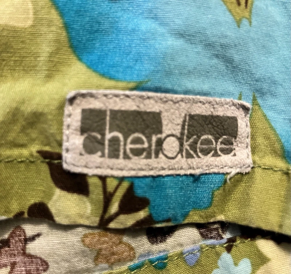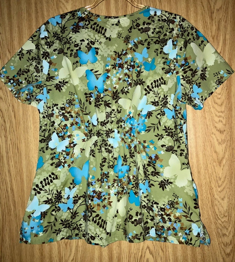 Cherokee Large scrub top. Very attractive, fitted with an elastic gathering on the back and 2 front pockets. See pictures Measurements are: Pit to pit = 21” (42) waist = 19” hip to hip 24”