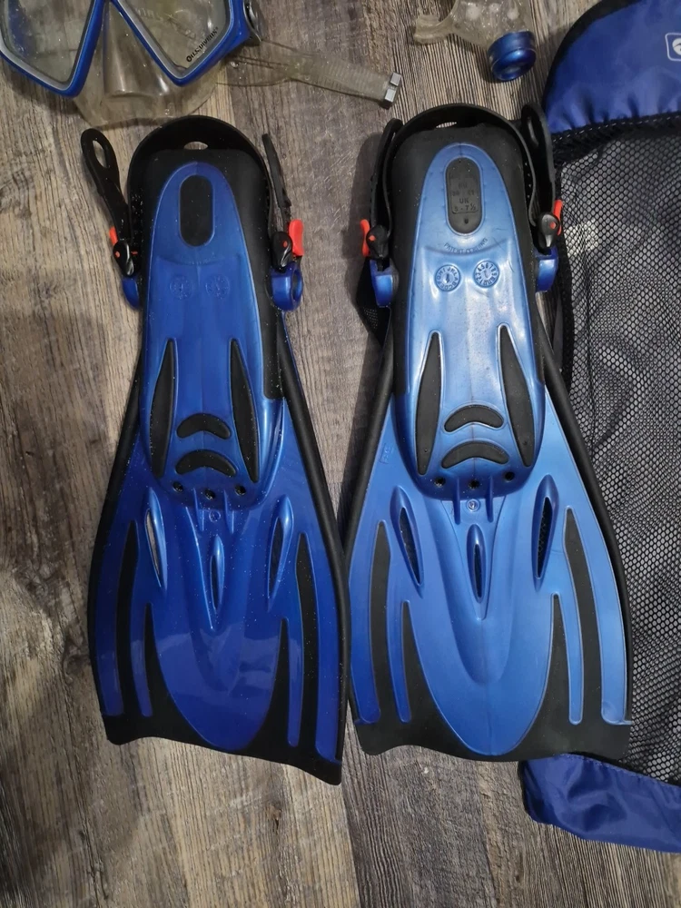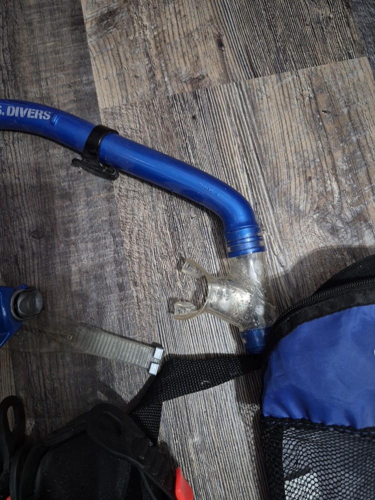 The Scuba U.S. Divers Dive Flippers are a high-quality pair of snorkel goggles designed for adult sizes S/M (US 4.5-8.5). Made by U.S. Divers, these flippers come with a convenient bag for easy transportation and storage. The flippers are durable and perfect for water sports enthusiasts looking to explore the underwater world. With a sleek design and a comfortable fit, these dive flippers are a must-have for any scuba or snorkeling adventure. These were acquired second hand so I do not have a bunch of information on them. Clear signs of use as these have sand debris. I have rinsed the pueces but Please sanitize the mouth and face pieces prior to use.