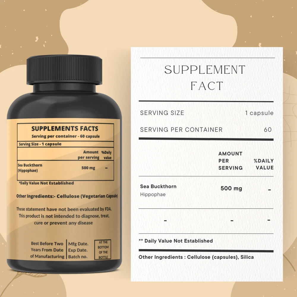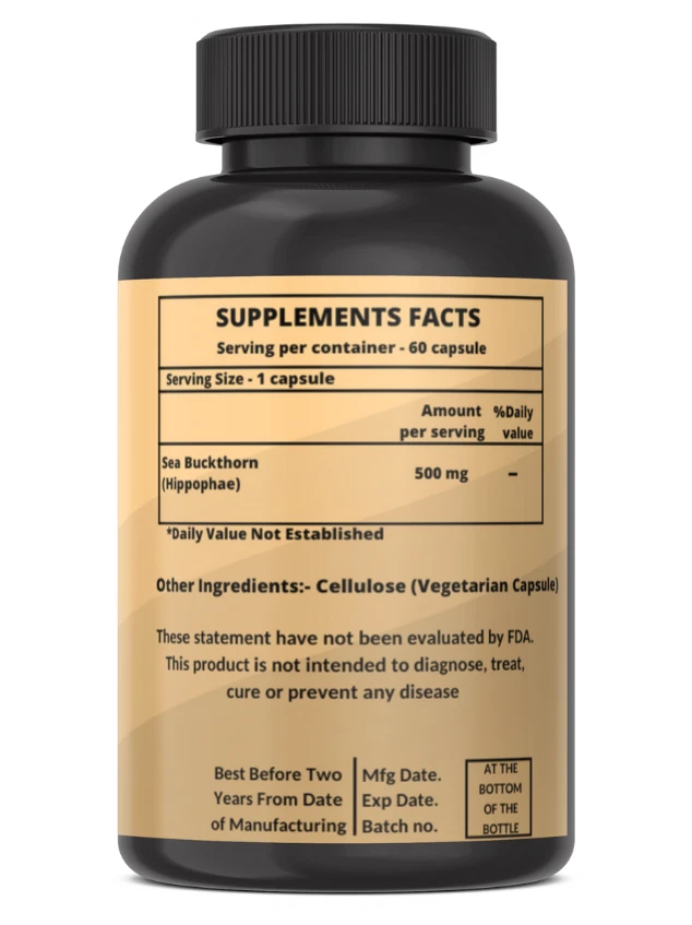 Heroot Sea Buckthorn capsules Sea buckthorn (Hippophae rhamnoides) is a plant found throughout Europe and Asia. The leaves, flowers, seeds, and fruits are used as medicine Sea buckthorn contains vitamins A, B1, B2, B6, and C, as well as other active ingredients. It's been used traditionally to slow down the aging process. People use sea buckthorn for burns, eczema, acne , indigestion , high blood pressure , wrinkled skin , and many other purposes, but there is no good scientific evidence to support most of uses. Don't confuse sea buckthorn with other plants known as "buckthorn," including alder buckthorn, European buckthorn, and Cascara sagrada. These are not the same. . Key Ingredients: Sea Buckthorn Key Benefits: Treat stomach or intestinal problems Improve blood pressure or blood cholesterol Prevent or manage blood vessel or heart disease Complement cancer treatment Improve symptoms of cirrhosis Directions For Use: As a dietary supplement, take one capsule per day with water or as recommended by your healthcare provider. Safety Information: Store in a cool dry place Keep out of reach of children If you are pregnant or lactating or prone to any food allergy or under any medical condition consult your healthcare practitioner before use Disclaimer The above description is for information and knowledge purpose, not a healthcare professional advice. Please consult your doctor and/or pharmacist before you take this vitamin. Pregnant or lactating women, diabetics, hypoglycemics, and people with known medical conditions and/or taking drugs, should consult with a licensed physician and/or pharmacist prior to starting any supplementation program. The above statements have not been evaluated by the Food & Drug Administration. Shipping and Handling Shipping time will be 1 business day after the cleared payment We will ship by Indian Post service Shipment will take 15-30 days. Few more days for your local customs delay and formalities. For Express service additional charges will be applied. For any reason you wish to leave Negative or neutral feedback, Please contact us first and let us mutually resolve it. We care for your satisfaction and will make sure that you are happy with the transaction to post us 5**** ratings in all areas. ***Customs Information*** Heroot will not be liable for packages refused or held by customs for delivery. We request that you contact customs office and ask about import regulations and restrictions before placing your order. It is importsnt for you to become familiar with customs policies for your specific country before ordering. Customs regulations differ by country and not knowing their regulations can result in your order incurring high import duties, the delivery being delayed or even returned. Please check with your customs office to see if your country permits the shipment of the products you are planning to order from us and if any additional licenses or permits are needed. Please note: if your order is returned to us due to banned/ restricted products policy, a wrong address, refusal to pay customs fees, refusal to accept the order or because no one was there to accept the delivery of your order, we will refund your order as follow: you will be refunded the total amount of the order, minus the original shipping charge.