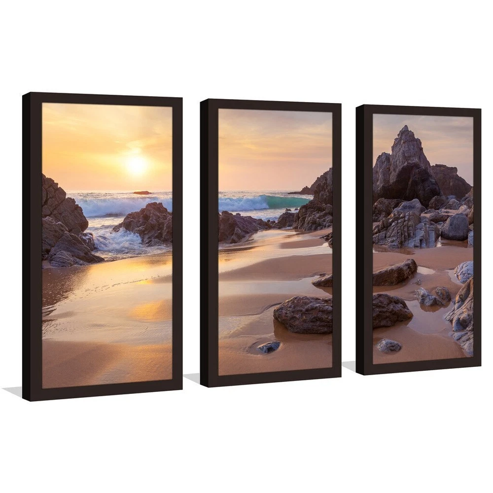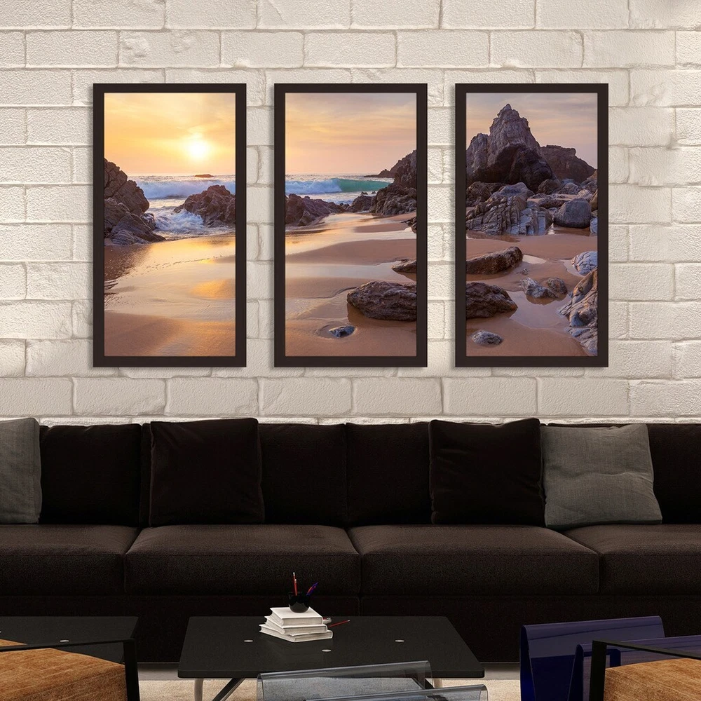 This Wall Art Set of 3 is printed on Plexiglass using a high-speed flatbed printer.Producing excellent print quality with a 6-color plus white UV-curable inkjet system.The breathtaking effect of fine art printed directly onto Acrylic is unique and exquisite.Its reflective vibrant colors creates a contemporary style of art that will bring depth to your walls.The artwork has been reprinted from the Artists' original piece with written permission.Made in North America & Arrives ready-to-hang.Frame: 1" EspressoThis framed art print is being custom built for you. Please allow 10 business days for the product to leave our warehouse. Shape: RectangleOrientation: HorizontalSubject: Photography, Sea & ShoreStyle: Fine Art Giclee, Contemporary Free Shipping Over $49.99* Details "Sea Landscape" Framed Plexiglass Wall Art Set of 3 Product Description: This Wall Art Set of 3 is printed on Plexiglass using a high-speed flatbed printer.Producing excellent print quality with a 6-color plus white UV-curable inkjet system.The breathtaking effect of fine art printed directly onto Acrylic is unique and exquisite.Its reflective vibrant colors creates a contemporary style of art that will bring depth to your walls.The artwork has been reprinted from the Artists' original piece with written permission.Made in North America & Arrives ready-to-hang.Frame1" EspressoThis framed art print is being custom built for you. Please allow 10 business days for the product to leave our warehouse. ShapeRectangle OrientationHorizontal SubjectPhotography, Sea & Shore StyleFine Art Giclee, Contemporary