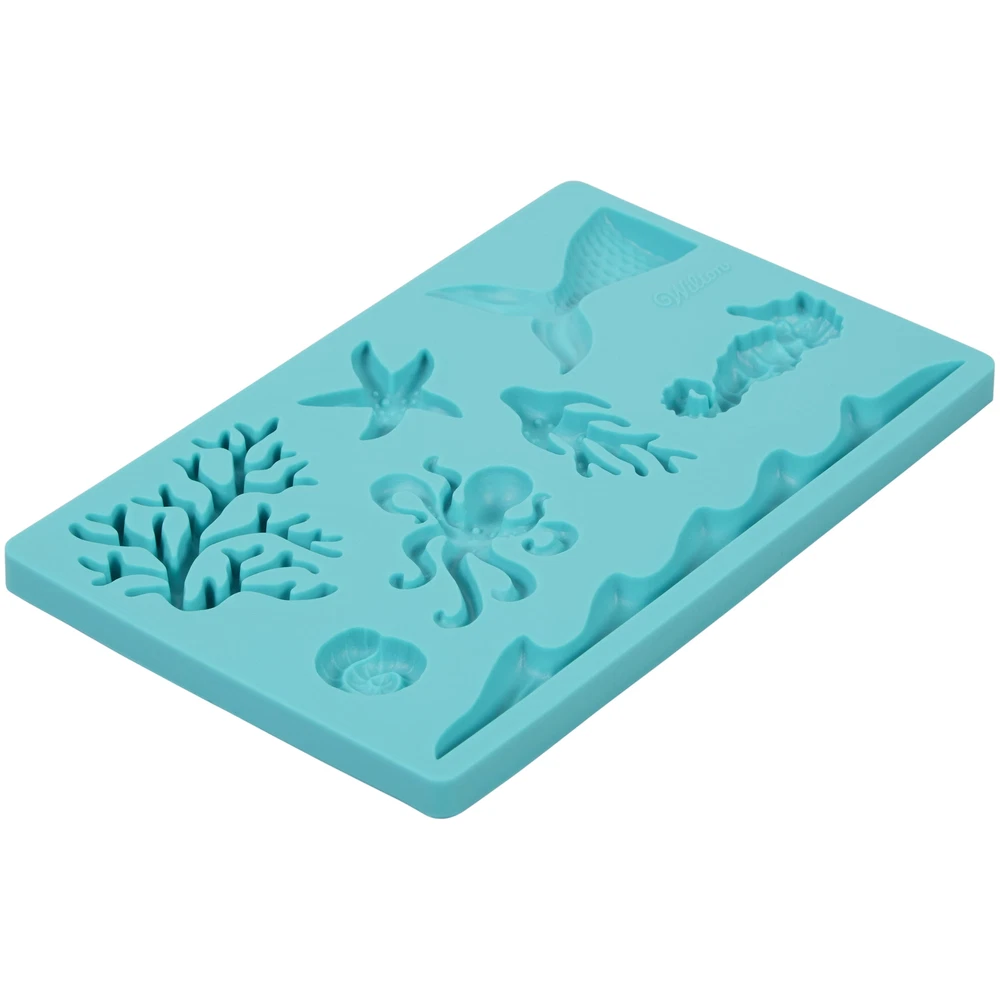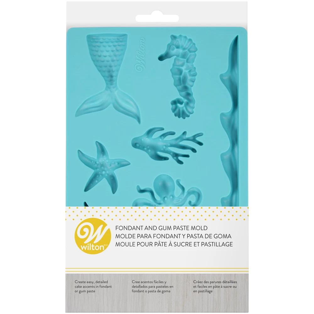 Create detailed fondant and gum paste decorations for cakes or sweet treats with this 8-Cavity Sea Life Silicone Fondant and Gum Paste Mold. Perfect for making marine-themed birthday cakes, cookies and other treats, this fondant mold is all you need to make cute, edible decorations. This sea life mold features 8 underwater-themed designs: a mermaid tail, a seahorse, a starfish, an octopus, a seashell, an underwater plant leaf, and 2 coral designs. To use, simply dust the mold with cornstarch or rub with solid vegetable shortening. Press your fondant or gum paste into the cavity. Trim off any excess and turn over to unmold your decoration! Make cute fondant and gum paste decorations with this sea life silicone fondant and gum paste mold This silicone fondant mold is perfect for making cute treats for themed birthday parties, baby showers and more Great for molding both fondant and gum paste Use shaped decorations to top cookies and cupcakes or create a fun border around a large cake To use: Prepare mold with cornstarch or solid vegetable shortening; press fondant or gum paste into desired cavity; using small spatula or knife, trim off excess fondant; turn mold over and bend to release fondant