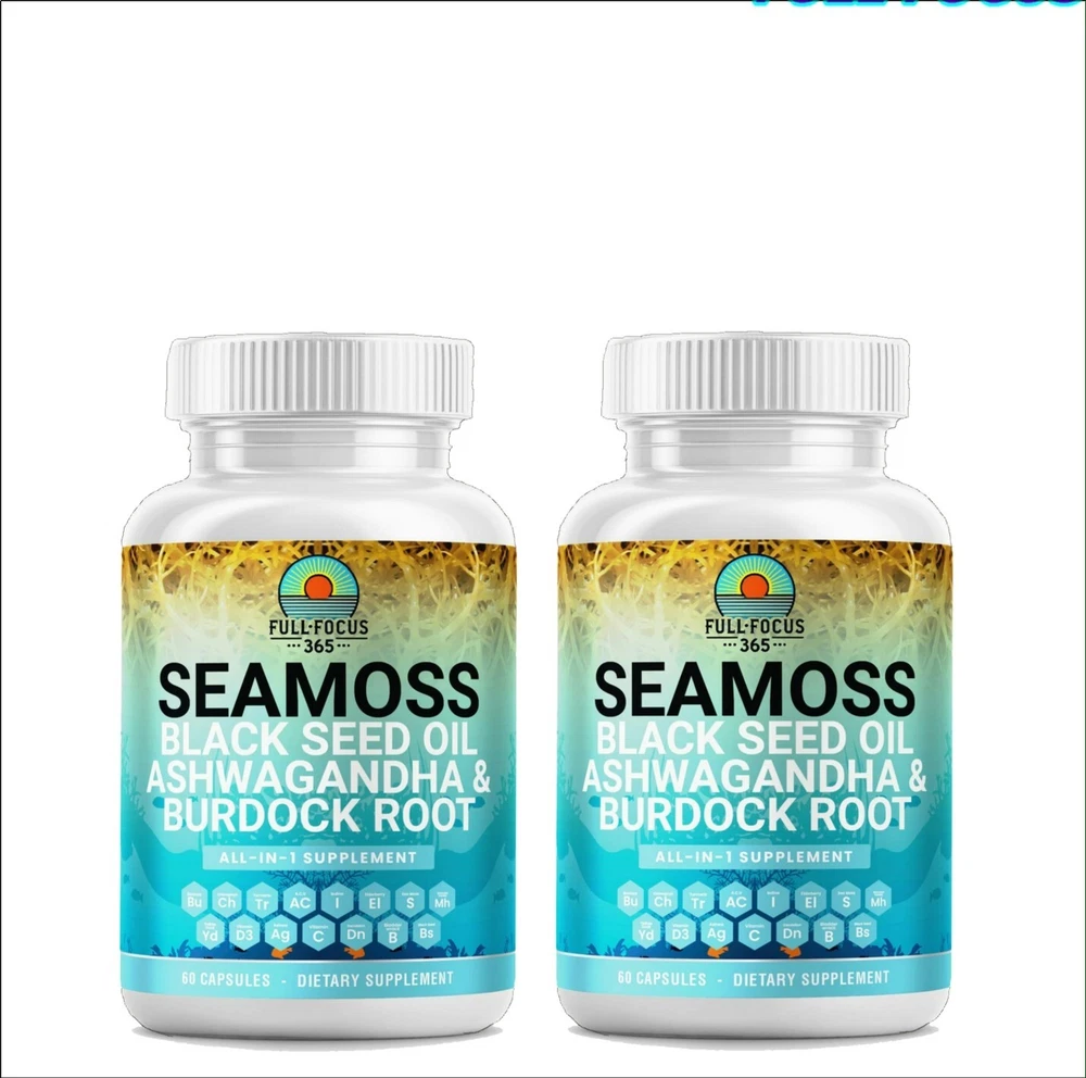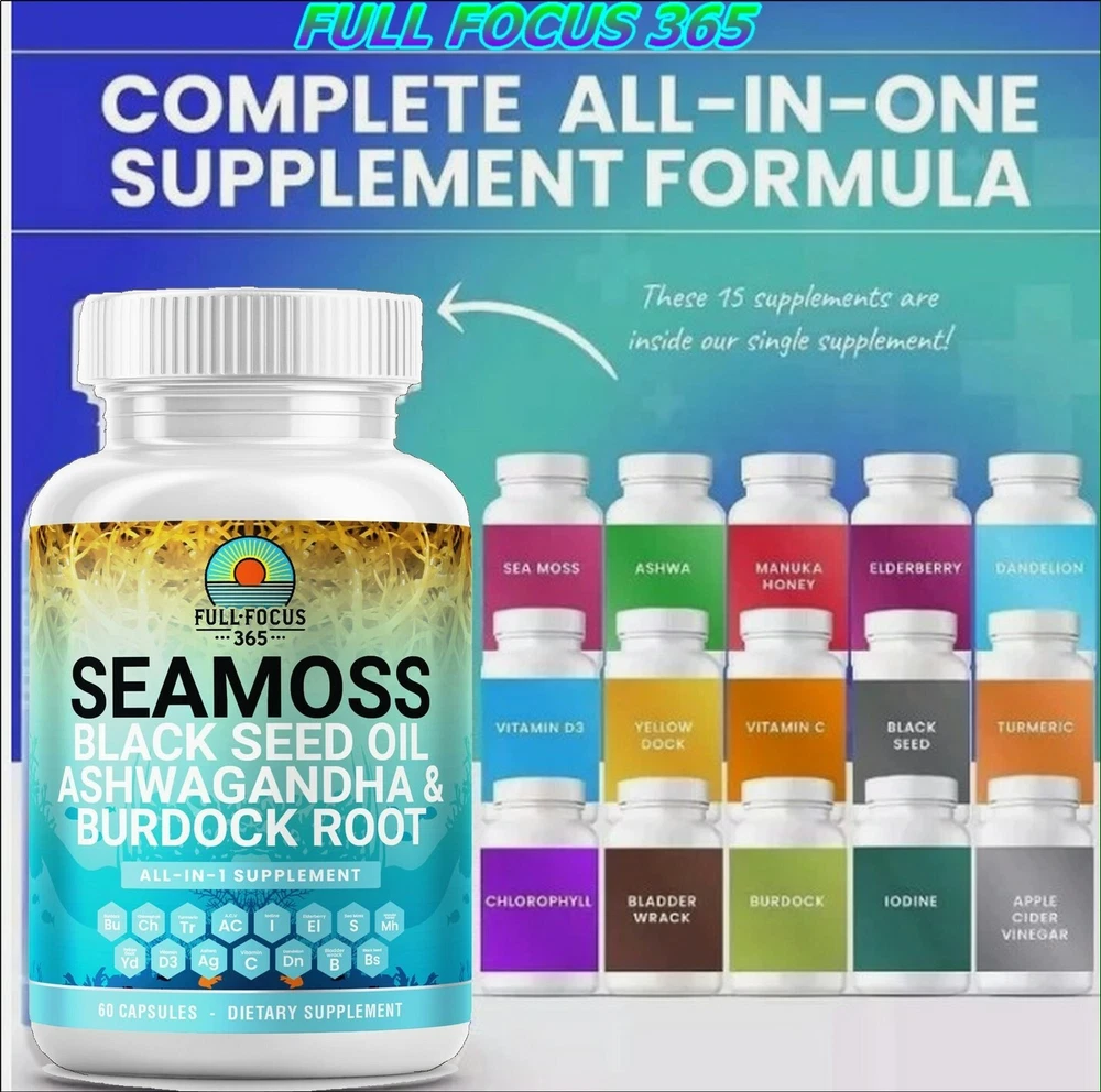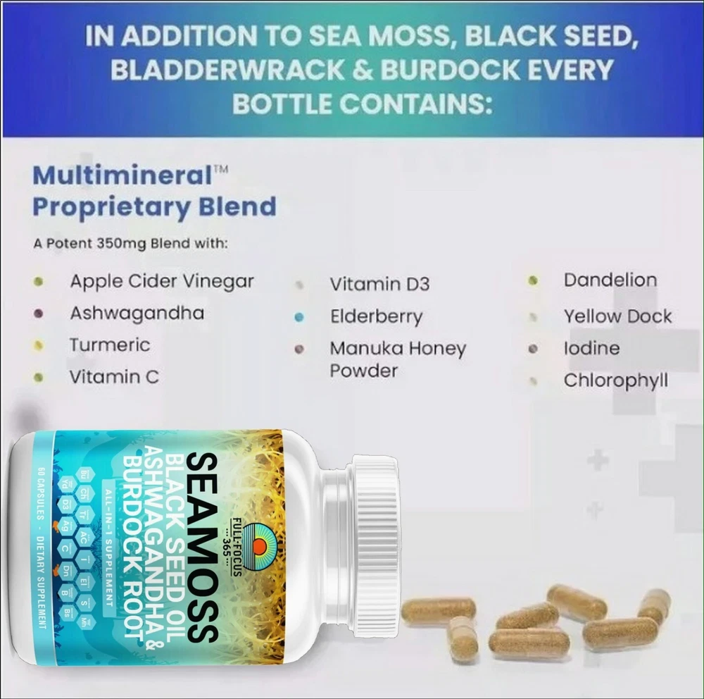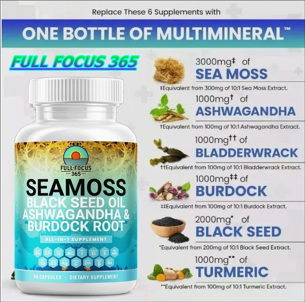 Irish sea Moss 3000mg Black Seed Oil 2000mg Ashwagandha 1000mg Turmeric 1000mg all in one antioxidant body rejuvenation its lab tested for potency and ships from USA fast handling Clean Irish Sea Moss Capsules For Women and Men - Our Sea moss Pills and Black Seed Oil for hair includes 15 ingredients such as Turmeric Curcuma Capsules, Bladderwrack capsules, Burdock roots, Chlorophyll and more! Sea Moss capsules with black seed have been combined and the results are amazing. Full Focus 365 has officially created the world’s most inclusive 15 in 1 raw sea moss, black seed capsules, ashwagandha extract, bladderwrack root, Burdock roots, turmeric curcumin capsules. The Raw Sea Moss and Black Seed Oil Capsules You’ve Been Looking For - Full Focus 365's MultiMineral provides 6 full-dose products in one, containing a full Irish Sea Moss Powder, Black Seed Powder, Ashwagandha Extract, Bladderwrack Powder, and Burdock Root Powder in a convenient all in one supplement! Finally, irish sea moss wildcrafted, black seed, ashwagandha powder, bladderwrack herb and burdock root pills have been packed into one convenient solution that's quick and easy to take. Introducing the MultiMineral Blend - Sea Moss Pills, Black Seed Oil Pills, Ashwagandha Root, Bladderwrack Capsules and Burdock Root Capsules that contain 10+ powerhouse ingredients, turmeric curcumin capsules, Apple Cider Vinegar, Chlorophyll, Manuka Honey, and more! These sea moss bladderwrack burdock root capsules are alternatives to sea moss gummies, black seed oil gummies, and ashwagandha gummies for men. Not usual sea moss raw organic, wildcrafted sea moss gel or ashwagandha supplements. A Powerful All In One Supplement - MultiMineral is overflowing with potent Sea Moss Supplement, Black Seed Oil capsules, Aswagandhada capsules, Burdock Root, Bladderwrack and turmeric powder. Clear out those countless supplements in your supplement cabinet, and replace it with just one sea moss powder, black seeds oil, aswagandhada capsules, and burdock supplement 15-in-1 formula from Nutraceuticals. We made Irish sea moss bladderwrack burdock capsules better by adding black seed. Vetted and Trusted Ingredients - We pride ourselves in offering quality sea moss raw, black seed oil health benefits, ashwagandha root, burdock root, and bladderwrack supplements for our customers. Our sea moss capsules, black seed cumin and ashwangha supplements formulas are proudly made in the USA to create trusted sea moss and bladderwrack capsules, black seed cumin oil, ashwagandha for men and bladderwrack supplement. No unneeded preservatives or fillers. Important information Information KEEP OUT OF REACH OF CHILDREN AND PETS. DO NOT USE IF SEAL IS DAMAGED OR MISSING. STORE IN A COOL, DRY PLACE. Do not exceed the recommended dose of 2 capsules per day of the MultiMineral Supplement. Pregnant or nursing mothers, children under the age of 18 and individuals with a known medical condition should consult a physician before using this or any other dietary supplement. Do not take this supplement if you are allergic to any of the listed ingredients. May adversely affect existing medical conditions, including but not limited to: indigestion, diarrhea, nausea, dizziness, upset stomach, vomiting, stomach pain, stomach cramps, feelings of itching, rashes, sickness, and allergic reactions. These possible side effects are rare and will vary from one person to another in occurrence and severity. If for any reason you experience any adverse effects or any other form of discomfort from this product, immediately discontinue use of the product and consult with your doctor or visit the hospital, emergency room, or clinic. Consult your healthcare professional before taking this supplement or any dietary supplement in combination with medication and/or other dietary supplements. The Expiration Date is located on the bottom of each bottle and follows this format: (EXP: MM/YYYY). (EXP = Expiration Date, M = Month, Y = Year). This should not be confused with the Lot Number that is printed after the text, “LOT”. Ingredients Sea Moss (Chondrus crispus 10:1 Extract) [Whole Plant] 300 mg [Whole Plant] (Equivalent to 3000mg of raw Irish Sea Moss powder), Black Seed (Nigella Sativa 10:1 Extract) 200 mg (Equivalent to 2000mg of raw Black Seed Oil powder), Ashwagandha (Withania Somnifera 10:1 Extract) 100 mg (Equivalent to 1000mg of raw Ashwagandha powder), Turmeric Curcumin (Curcuma Longa 10:1 Extract) [Root] 100 mg (Equivalent to 1000mg of raw Turmeric Curcumin powder), Bladderwrack (Fucus Vesiculosus 10:1 Extract) [Whole Plant] 100 mg (Equivalent to 1000mg of raw Bladderwrack powder), Burdock (Arctium 10:1 Extract) [Root] 100 mg (Equivalent to 1000mg of raw Burdock powder), Vitamin C (as Ascorbic Acid), Vitamin D3 (as Cholecalciferol), MultiMineral Blend with Apple Cider Vinegar (Malus domestica) [Fruit] Powder, Dandelion (Taraxacum officinale) [Root] Extract, Yellow Dock (Rumex crispus) [Root] Powder, Elderberry (Sambucus willamsii hance) [Fruit] Extract, Iodine (From kelp), Manuka Honey (Leptospermum scoparium) [Root] Powder, Chlorophyll. Directions Take 2 capsules of the MultiMineral Sea Moss Supplement with an 8oz glass of water and a meal or as directed by your doctor. Please do not take more than 2 capsules per day. If you're unsure about the right dosage, consult your healthcare professional. The Expiration Date is on the bottom of each bottle, and it follows this format: (EXP: MM/YYYY). (EXP = Expiration Date, M = Month, Y = Year). This should not be confused with the Lot Number that is printed after the text, “LOT”. Legal Disclaimer Statements regarding dietary supplements have not been evaluated by the FDA and are not intended to diagnose, , cure, or prevent any disease or health condition.