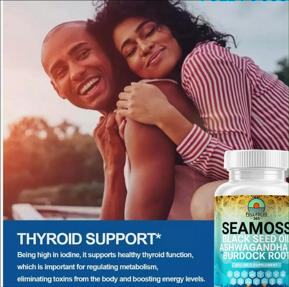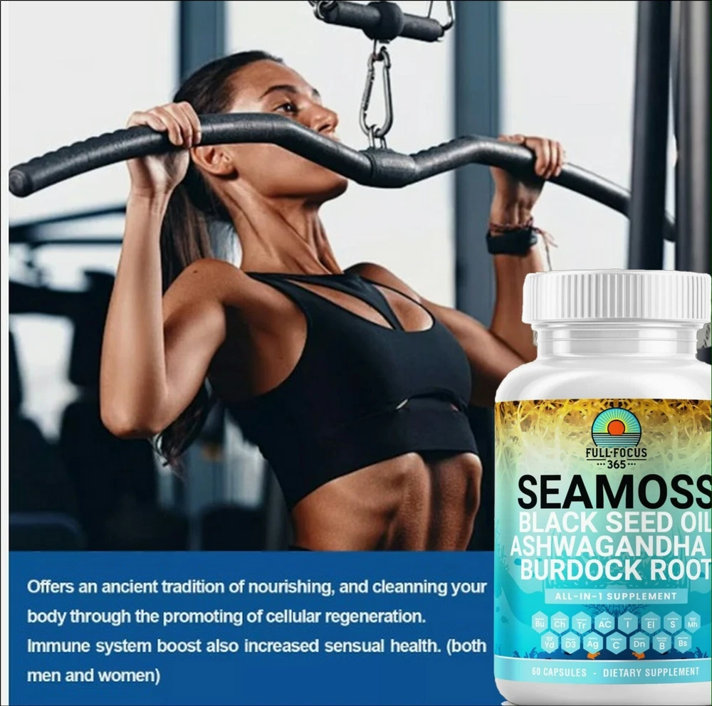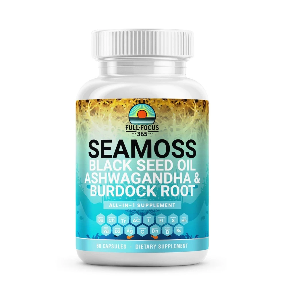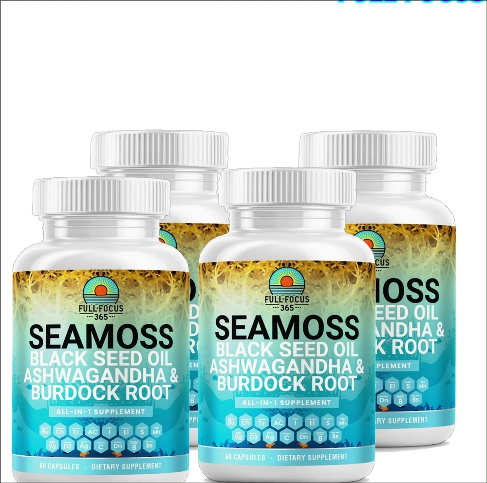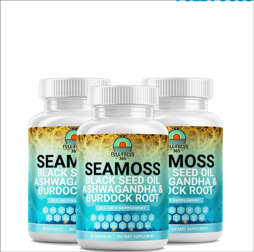 Irish sea Moss 3000mg Black Seed Oil 2000mg Ashwagandha 1000mg Turmeric 1000mg all in one antioxidant body rejuvenation its lab tested for potency and ships from USA fast handling Clean Irish Sea Moss Capsules For Women and Men - Our Sea moss Pills and Black Seed Oil for hair includes 15 ingredients such as Turmeric Curcuma Capsules, Bladderwrack capsules, Burdock roots, Chlorophyll and more! Sea Moss capsules with black seed have been combined and the results are amazing. Full Focus 365 has officially created the world’s most inclusive 15 in 1 raw sea moss, black seed capsules, ashwagandha extract, bladderwrack root, Burdock roots, turmeric curcumin capsules. The Raw Sea Moss and Black Seed Oil Capsules You’ve Been Looking For - Full Focus 365's MultiMineral provides 6 full-dose products in one, containing a full Irish Sea Moss Powder, Black Seed Powder, Ashwagandha Extract, Bladderwrack Powder, and Burdock Root Powder in a convenient all in one supplement! Finally, irish sea moss wildcrafted, black seed, ashwagandha powder, bladderwrack herb and burdock root pills have been packed into one convenient solution that's quick and easy to take. Introducing the MultiMineral Blend - Sea Moss Pills, Black Seed Oil Pills, Ashwagandha Root, Bladderwrack Capsules and Burdock Root Capsules that contain 10+ powerhouse ingredients, turmeric curcumin capsules, Apple Cider Vinegar, Chlorophyll, Manuka Honey, and more! These sea moss bladderwrack burdock root capsules are alternatives to sea moss gummies, black seed oil gummies, and ashwagandha gummies for men. Not usual sea moss raw organic, wildcrafted sea moss gel or ashwagandha supplements. A Powerful All In One Supplement - MultiMineral is overflowing with potent Sea Moss Supplement, Black Seed Oil capsules, Aswagandhada capsules, Burdock Root, Bladderwrack and turmeric powder. Clear out those countless supplements in your supplement cabinet, and replace it with just one sea moss powder, black seeds oil, aswagandhada capsules, and burdock supplement 15-in-1 formula from Nutraceuticals. We made Irish sea moss bladderwrack burdock capsules better by adding black seed. Vetted and Trusted Ingredients - We pride ourselves in offering quality sea moss raw, black seed oil health benefits, ashwagandha root, burdock root, and bladderwrack supplements for our customers. Our sea moss capsules, black seed cumin and ashwangha supplements formulas are proudly made in the USA to create trusted sea moss and bladderwrack capsules, black seed cumin oil, ashwagandha for men and bladderwrack supplement. No unneeded preservatives or fillers. Important information Information KEEP OUT OF REACH OF CHILDREN AND PETS. DO NOT USE IF SEAL IS DAMAGED OR MISSING. STORE IN A COOL, DRY PLACE. Do not exceed the recommended dose of 2 capsules per day of the MultiMineral Supplement. Pregnant or nursing mothers, children under the age of 18 and individuals with a known medical condition should consult a physician before using this or any other dietary supplement. Do not take this supplement if you are allergic to any of the listed ingredients. May adversely affect existing medical conditions, including but not limited to: indigestion, diarrhea, nausea, dizziness, upset stomach, vomiting, stomach pain, stomach cramps, feelings of itching, rashes, sickness, and allergic reactions. These possible side effects are rare and will vary from one person to another in occurrence and severity. If for any reason you experience any adverse effects or any other form of discomfort from this product, immediately discontinue use of the product and consult with your doctor or visit the hospital, emergency room, or clinic. Consult your healthcare professional before taking this supplement or any dietary supplement in combination with medication and/or other dietary supplements. The Expiration Date is located on the bottom of each bottle and follows this format: (EXP: MM/YYYY). (EXP = Expiration Date, M = Month, Y = Year). This should not be confused with the Lot Number that is printed after the text, “LOT”. Ingredients Sea Moss (Chondrus crispus 10:1 Extract) [Whole Plant] 300 mg [Whole Plant] (Equivalent to 3000mg of raw Irish Sea Moss powder), Black Seed (Nigella Sativa 10:1 Extract) 200 mg (Equivalent to 2000mg of raw Black Seed Oil powder), Ashwagandha (Withania Somnifera 10:1 Extract) 100 mg (Equivalent to 1000mg of raw Ashwagandha powder), Turmeric Curcumin (Curcuma Longa 10:1 Extract) [Root] 100 mg (Equivalent to 1000mg of raw Turmeric Curcumin powder), Bladderwrack (Fucus Vesiculosus 10:1 Extract) [Whole Plant] 100 mg (Equivalent to 1000mg of raw Bladderwrack powder), Burdock (Arctium 10:1 Extract) [Root] 100 mg (Equivalent to 1000mg of raw Burdock powder), Vitamin C (as Ascorbic Acid), Vitamin D3 (as Cholecalciferol), MultiMineral Blend with Apple Cider Vinegar (Malus domestica) [Fruit] Powder, Dandelion (Taraxacum officinale) [Root] Extract, Yellow Dock (Rumex crispus) [Root] Powder, Elderberry (Sambucus willamsii hance) [Fruit] Extract, Iodine (From kelp), Manuka Honey (Leptospermum scoparium) [Root] Powder, Chlorophyll. Directions Take 2 capsules of the MultiMineral Sea Moss Supplement with an 8oz glass of water and a meal or as directed by your doctor. Please do not take more than 2 capsules per day. If you're unsure about the right dosage, consult your healthcare professional. The Expiration Date is on the bottom of each bottle, and it follows this format: (EXP: MM/YYYY). (EXP = Expiration Date, M = Month, Y = Year). This should not be confused with the Lot Number that is printed after the text, “LOT”. Legal Disclaimer Statements regarding dietary supplements have not been evaluated by the FDA and are not intended to diagnose, , cure, or prevent any disease or health condition.