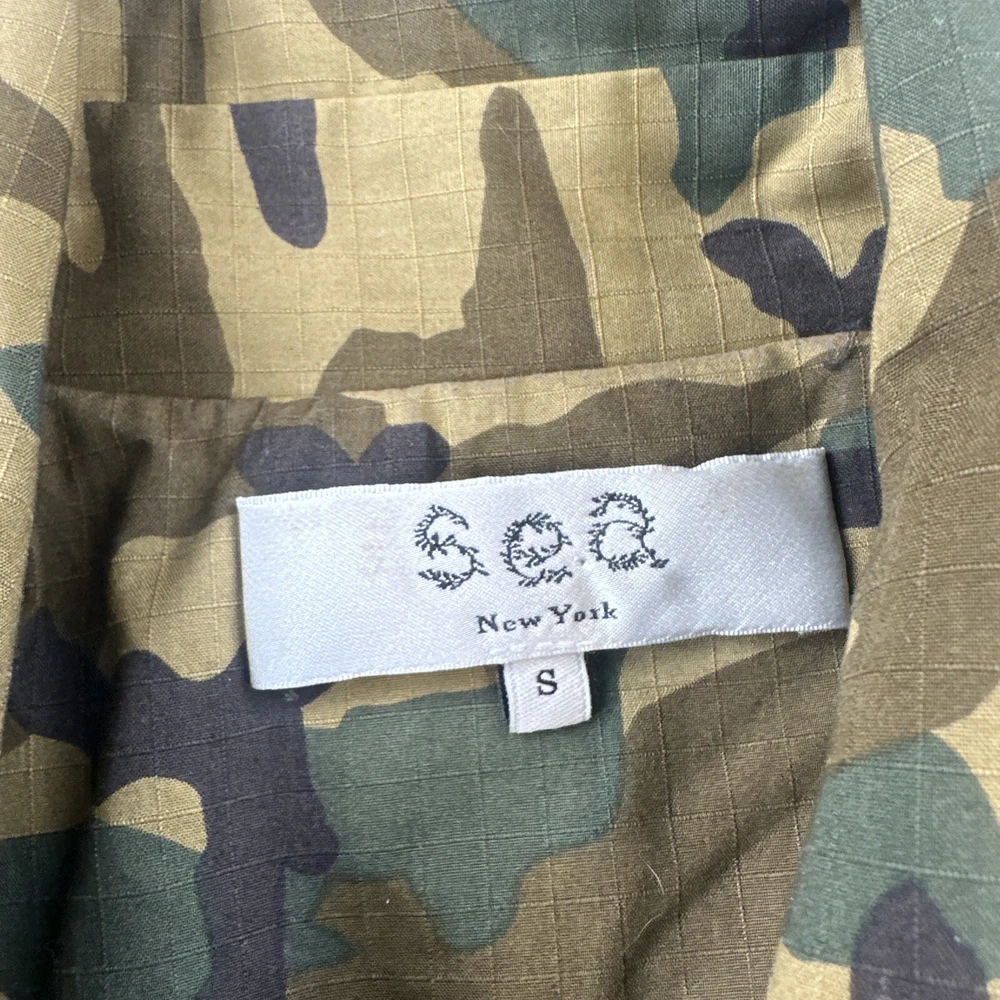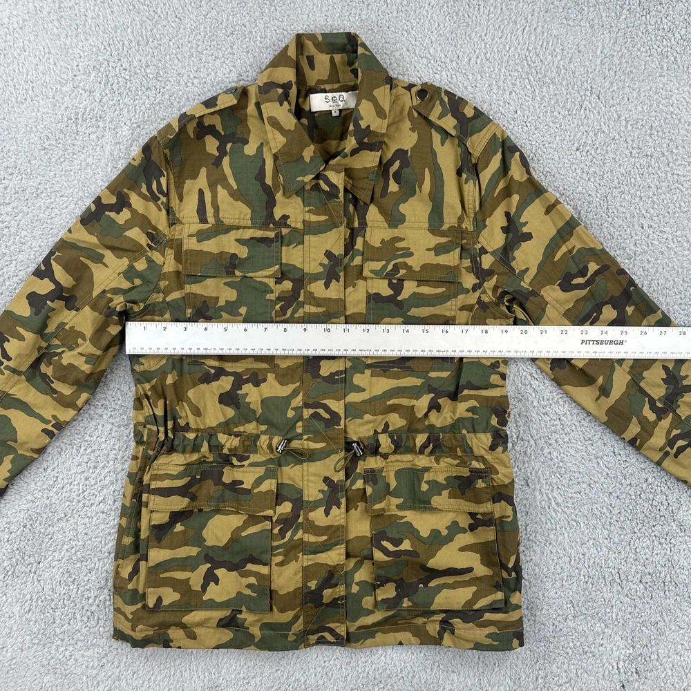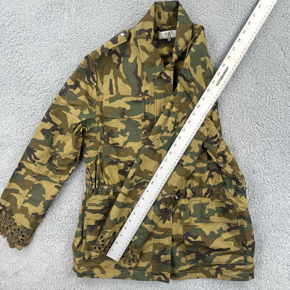 This Sea New York women's jacket in size S features a unique camouflage pattern with eyelet lace trim. The mid-length military-style jacket is made of comfortable cotton material, perfect for casual occasions. The multicolor design adds a pop of color to any outfit, making it a great addition to any wardrobe. Ideal for those who love colorful and unique fashion, this jacket is sure to make a statement.