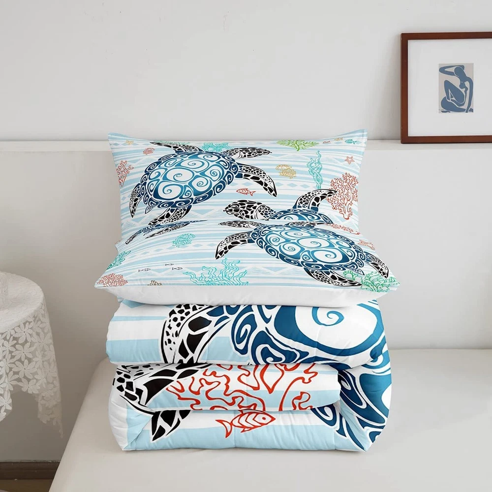 Sea Turtle Bedding Set Kawaii Room Decor, Coastal Beach Themed Comforter Set Full Size For Kids Teen Girls Boys Adult Bedroom, Blue White Stripes Quilt Sea Animal Underwater World Down Comforter Product Details Color: Blue Size: Full Brand: Erosebridal MPN: Does not apply UPC: Does not apply EAN: Does not apply Size: Full Included Components: 1 Comforter + 2 Pillow Cases Color: Blue Style: Modern Brand: Erosebridal Size: Full Included Components: 1 Comforter + 2 Pillow Cases Color: Blue Style: Modern Brand: Erosebridal Theme: Sea Turtle Pattern: Sea Turtle Material: Polyester Fabric Type: Material: Made With 400 Gsm Brushed Microfiber and Polyester Filling. Number of Pieces: 3 Seasons: All, Winter, Summer, Fall Thread Count: 400 Product Care Instructions: Machine Wash Manufacturer: Erosebridal Item dimensions L x W x H: 90 x 79 x 1 inches Product Dimensions: 90 x 79 x 1 inches Item Weight: 4.3 pounds Date First Available: April 15, 2023 Full size bed set includes 1 comforter (79 by 90 inches) and 2 pillow cases (20 by 30 inches). Machine washable and tumble dryable at low temperature for easy care. Do not bleach. Soft Fabric: Our comforter set with microfiber offers softness and breathability, which creates a comfortable sleep for you. The material is weaved by complicated post-grinding process. Lightweight: This textured bed set is lightweight but warm enough. It's convenient to take when you travel or take part in outdoor activities. It's suitable for all seasons. Other Products of the Same Pattern: Our store has other home series of the same pattern of the comforter set (bedspread,coverlet set, bed sheet, fitted sheet, duvet cover, throw blanket, tapestry, window curtains, tabletop, bath curtain, floor mat). You can decorate your room with the same style as you like. Fashion Design:The comforter and pillow cases are printed with pattern on the front side and white colored on the reverse (gamepad patterned items are printed both sides).This Modern printing Bedding Quilt,is Not Only match for Your Own Bedroom, Guestroom, Livingroom, But Also a present Idea for Boys Girls Teens Women Men Child Boyfriend Girlfriend Adults.