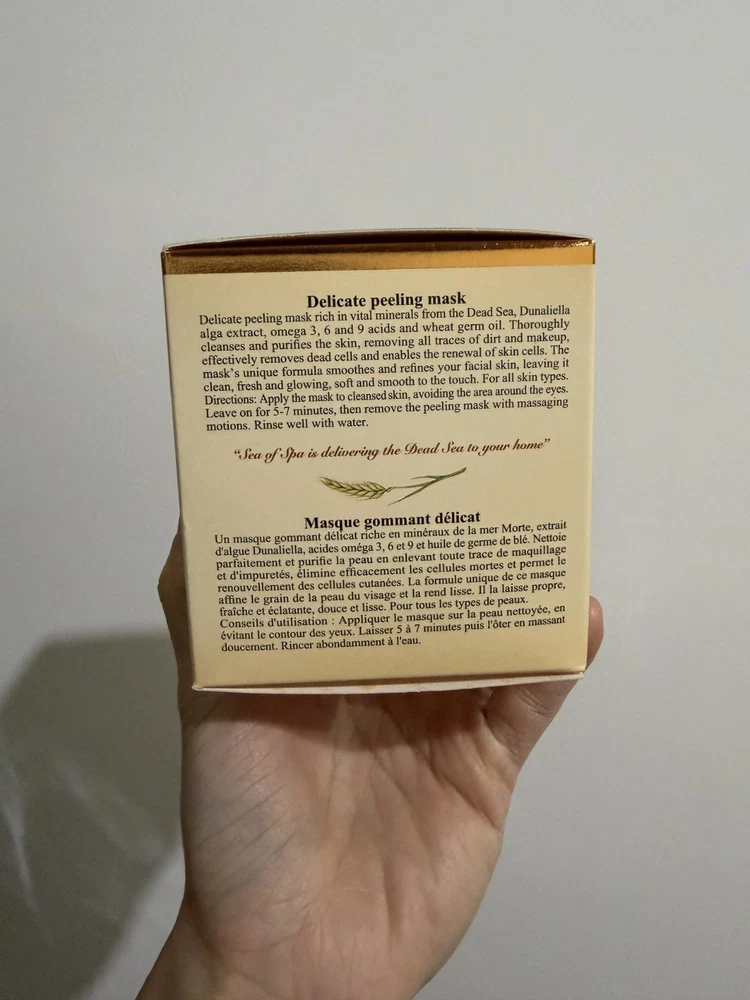 EXP: 8/2027 Delicate peeling mask rich in vital minerals from the Dead Sea, Dunaliella Algae extract, Omega-3, 6 and 9 acids and wheat germ oil. For All Skin Types. Size: 50ml / 1.7 Fl. Oz. Made in Israel. Paraben Free. Thoroughly cleanses and purifies the skin, removes the traces of dirt and makeup, effectively removes dead cells and enables the renewal of skin cells. The mask's unique formula smoothes and refines your facial skin, leaving it clean, fresh and glowing, soft and smooth to the touch. For all skin types. Directions for use: Apply mask to clean skin, avoiding the area around the eyes, leave it for 5-7 minutes, then remove the mask with the massaging movements. Thoroughly rinse with water. Licensed by the Israeli Ministry of Health.