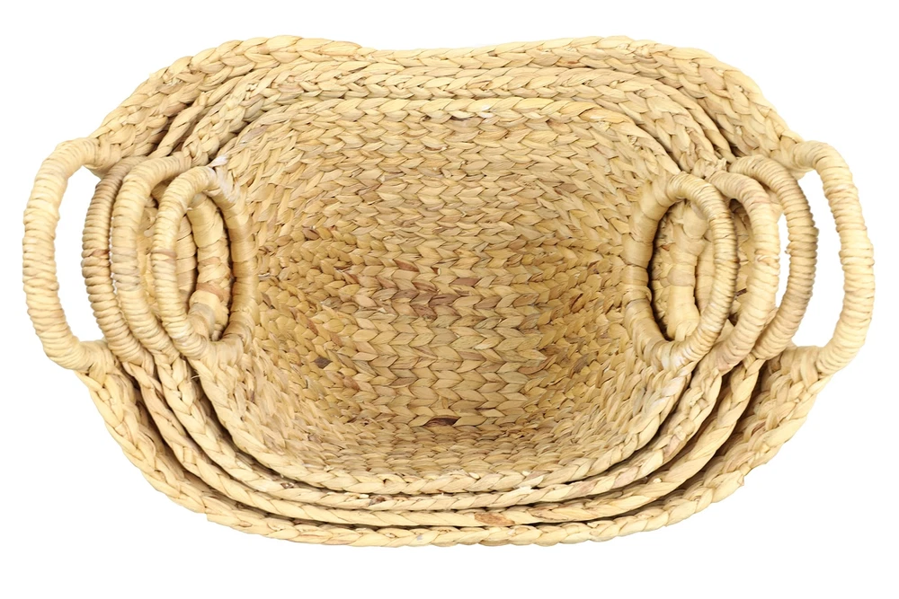 Use in your living room as home storage for throw blankets and pillows, bathroom for towels, or anywhere in the house as decorative baskets. This item ships in 1 carton. Due to the handmade nature of these, there will be slight color, shape, and size variations, as well as loose fibers. Suitable for indoor use only. This item ships fully assembled in one piece. Maximum weight limit is 5 lbs. Made in Vietnam. This brown colored basket organizer comes as a set of 4. Contemporary style. CONTEMPORARY THEME Embrace artistic expression with a style that highlights bold designs with sleek lines, neutral elements, and a minimalist aesthetic MADE OF SEAGRASS These wicker storage baskets are woven using dried water hyacinth fibers BROWN AND WHITE UNFINISHED FINISH Natural light beige water hyacinth rattan is braided into staggered oval shapes with curved silhouettes and circular handles FEATURES OVAL STORAGE BASKET Four nesting, oval, natural wicker baskets with white color blocking and easy-carry handles 4 PIECES CONVENIENTLY SIZED This item measures 17L x 15W x 17H, 15L x 14W x 15H, 13L x 13W x 14H, 12L x 11W x 13H inches, and weighs 6 lbs