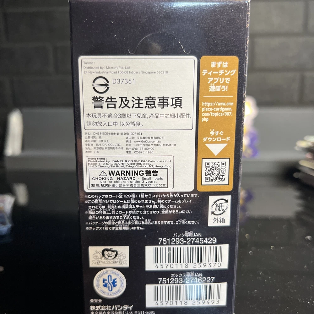 This is a sealed box of Japanese One Piece CCG cards from the set The Four Emperors. The box contains booster packs and is in configuration box. The cards are in Japanese language and feature the game's iconic characters. The box is perfect for collectors and fans of the anime and manga series. This item is a great addition to any collection and is sold by a US seller.