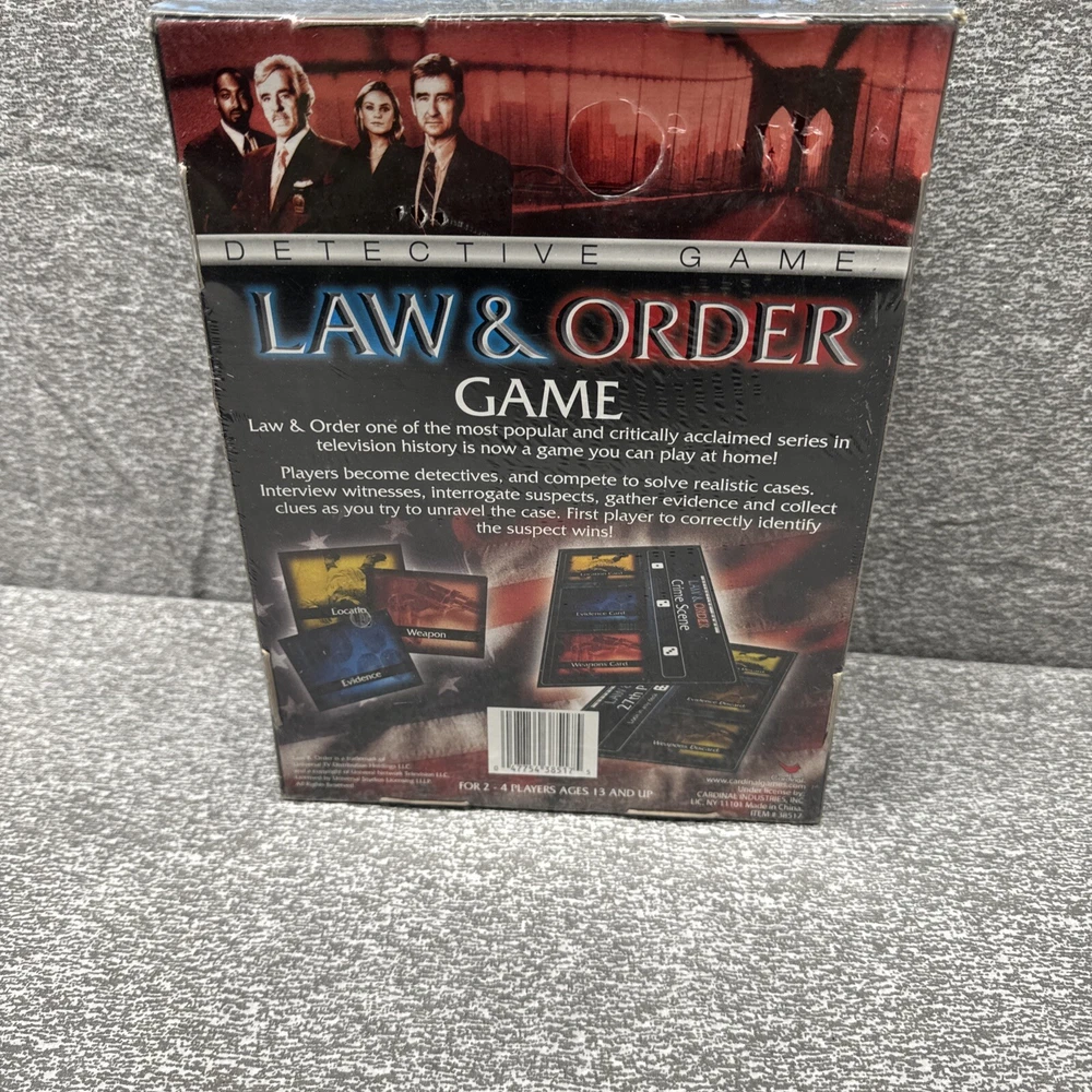 Game:Law & Order Detective GameGame Title:Law & Order GameGame Type:Board GameTheme:CrimeRecommended Age Range:13+Ages:Ages 13 and UPType:Complete Gamegtin13:047754385175Min. Number of Players:2 playersYear:2015Country/Region of Manufacture:ChinaBrand:CardinalMPN:38517UPC:047754385175