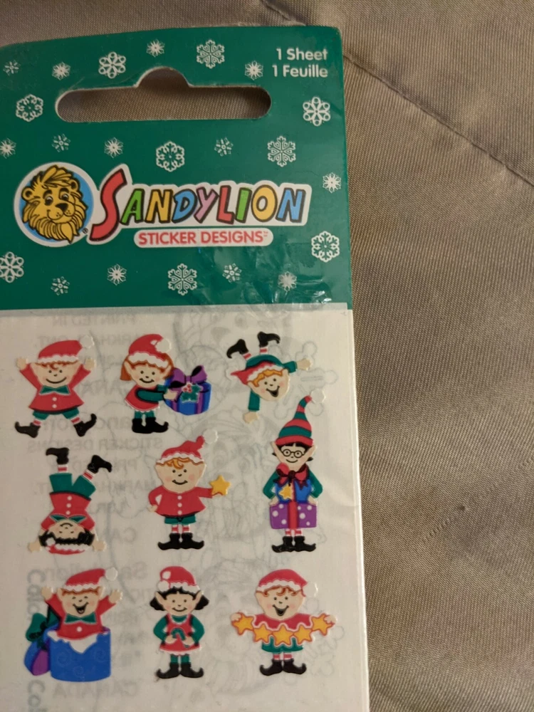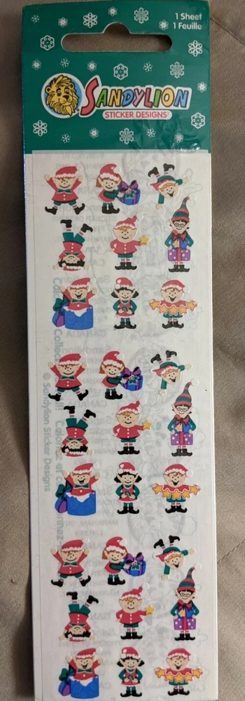 New in package Sandylion Christmas elves stickers. The final set that will be sold has a small tear as seen in the pictures.